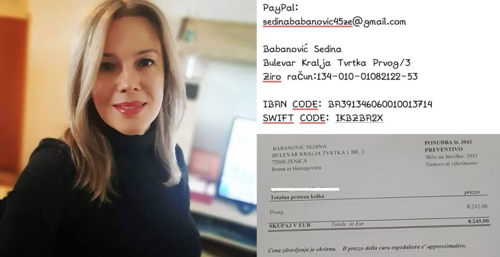 – Poštovani prijatelji.. poznanici…od ranije ste upoznati s mojim zdravstvenim problemima..pratili ste moj apel i sva desavanja koja su bila..podržavali me i svojim prilozima omogućili da odem na operaciju koja je uspješno uradena na klinici u Sloveniji. Zbog toga sam vam jako zahvalna jer bez vas ništa ne bih mogla uraditi. Nažalost..sada sam dosla opet u tu situaciju da se oglasim..jer imam problem s drugim kukom koji se mora uradit u sto kraćem roku.. tačcnije receno..da se ugradi druga proteza. Kroz ovaj problem stradaju i koljena zbog čega sam morala uraditi terapiju krvnom plazmom lijevog koljena. Kako ne bih ugrozila protezu koju sam tek ugradila ova operacija se mora uraditi u sto kraćem roku. Ovom prilikom vas molim da bar podijelite ovaj moj apel da sto više dobrih ljudi vide..ako neko ima neki prijedlog za realizaciju mog apela molila bih da mi se javi sa svojom idejom.. Vjerujte da nije jednostavno opet se oglasiti na ovaj način..ali nemam drugog izlaza. Nadam se da će biti i konačna operacija..30- ta po redu i da ću uz Allahovu pomoć hodati kao svaki čovjek. Srdačno vas sve pozdravljam i unaprijed zahvaljujem . U prilogu objavljujem predračun koji iznosi 8.245  eura.. i moj žiro račun..