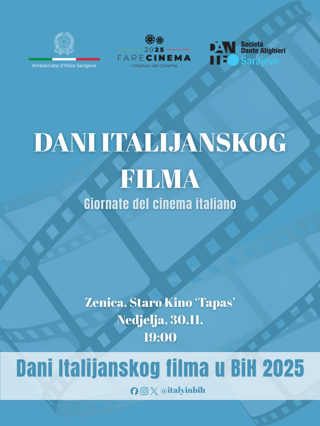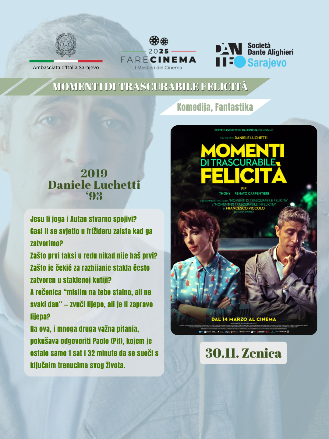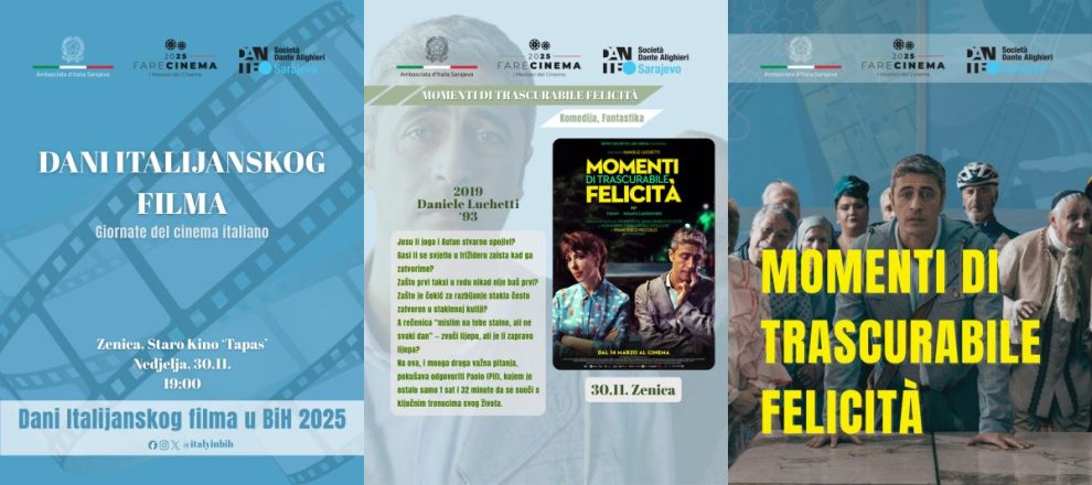 U okviru manifestacije “Sedmica italijanskog filma u BiH”, koju organizuje Ambasada Italije u Bosni i Hercegovini, Zenica će 30. novembra ugostiti posebnu filmsku projekciju posvećenu savremenoj italijanskoj kinematografiji.