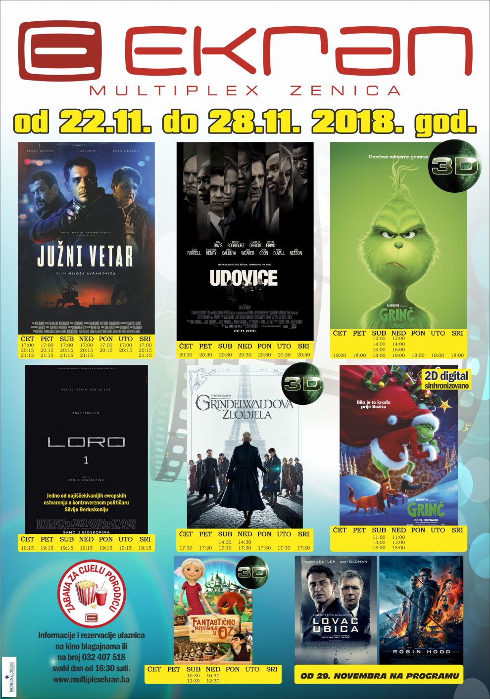 U periodu od 22. do 29. novembra publika Multiplexa Ekran Zenica će uživati u različitim filmskim ostvarenjima uključujući i jedan od najiščekivanijih filmova o kontraverznom političaru Silviju Berluskoniju „Loro 1“. Redatelj Steve McQueen, dobitnik nagrade Oscar za 12 godina ropstva i scenaristica Gillian Flynn, poznata po napetom trileru Nestala, donose moderni ženski triler o kriminalu, korupciji i strasti, “Udovice”. Nakon punih 18 godina, omiljeno zeleno gunđalo vraća se na velike ekrane i to ovog puta u animiranom obliku. Još zeleniji i još mrzovoljniji, odlučan je u namjeri da upropasti Božić u selu Whoville: “Danas ćemo raditi zločeste stvari, *i* radit ćemo ih sa stilom!” Ovaj film publika će imati priliku da gleda u 2D i 3D projekcijama. Krimi film “Južni vetar”, koji je i dalje najgledaniji film kako u BiH, tako i u regionu, će biti I naredne sedmice na programu Multiplexa Ekran Zenica.