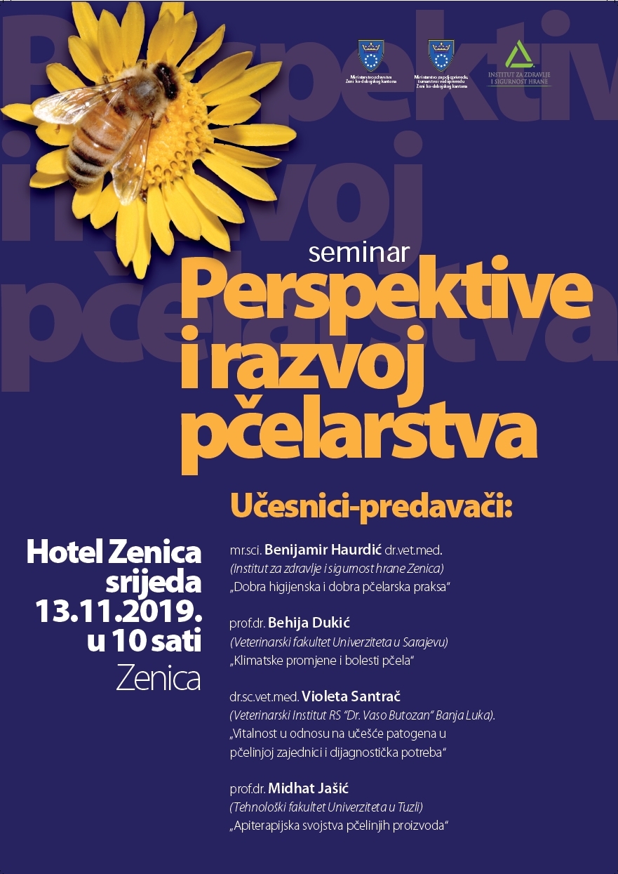 Seminar će biti održan u Zenici, u srijedu 13. novembra, sa početkom u 10 sati, u hotelu “Zenica”, a učesnici-predavači i teme na seminaru su mr.sci. Benijamir Haurdić dr.vet.med. (Institut za zdravlje i sigurnost hrane Zenica) – „Dobra higijenska i dobra pčelarska praksa“; prof. dr. Behija Dukić (Veterinarski fakultet Univerziteta u Sarajevu) – Klimatske promjene i bolesti pčela“; dr.sc.vet.med. Violeta Santrač (Veterinarski Institut RS “Dr. Vaso Butozan“ Banja Luka) – „Vitalnost u odnosu na učešće patogena u pčelinjoj zajednici i dijagnostička potreba“ i prof.dr. Midhat Jašić (Tehnološki fakultet Univerziteta u Tuzli) – „Apiterapijska svojstva pčelinjih proizvoda“.