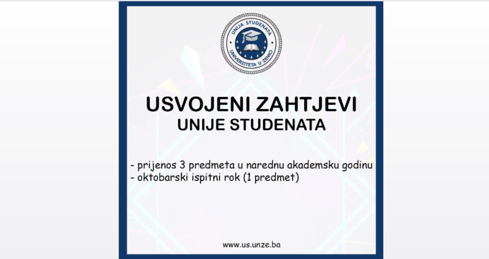 Senat UNZE usvojio zahtjeve Unije studenata- Danas je održana nova sjednica Senata UNZE na kojoj su usvojeni određeni zahtjevi Unije studenata.