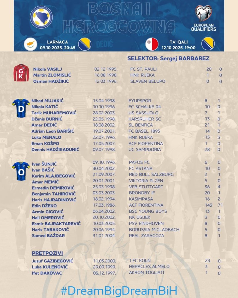 Sergej Barbarez objavio spisak reprezentacije BiH, trojica povratnika među Zmajeve! – Selektor reprezentacije Bosne i Hercegovine Sergej Barbarez odabrao je igrače za utakmicu kvalifikacija za Svjetsko prvenstvo protiv Kipra i prijateljski meč s Maltom.