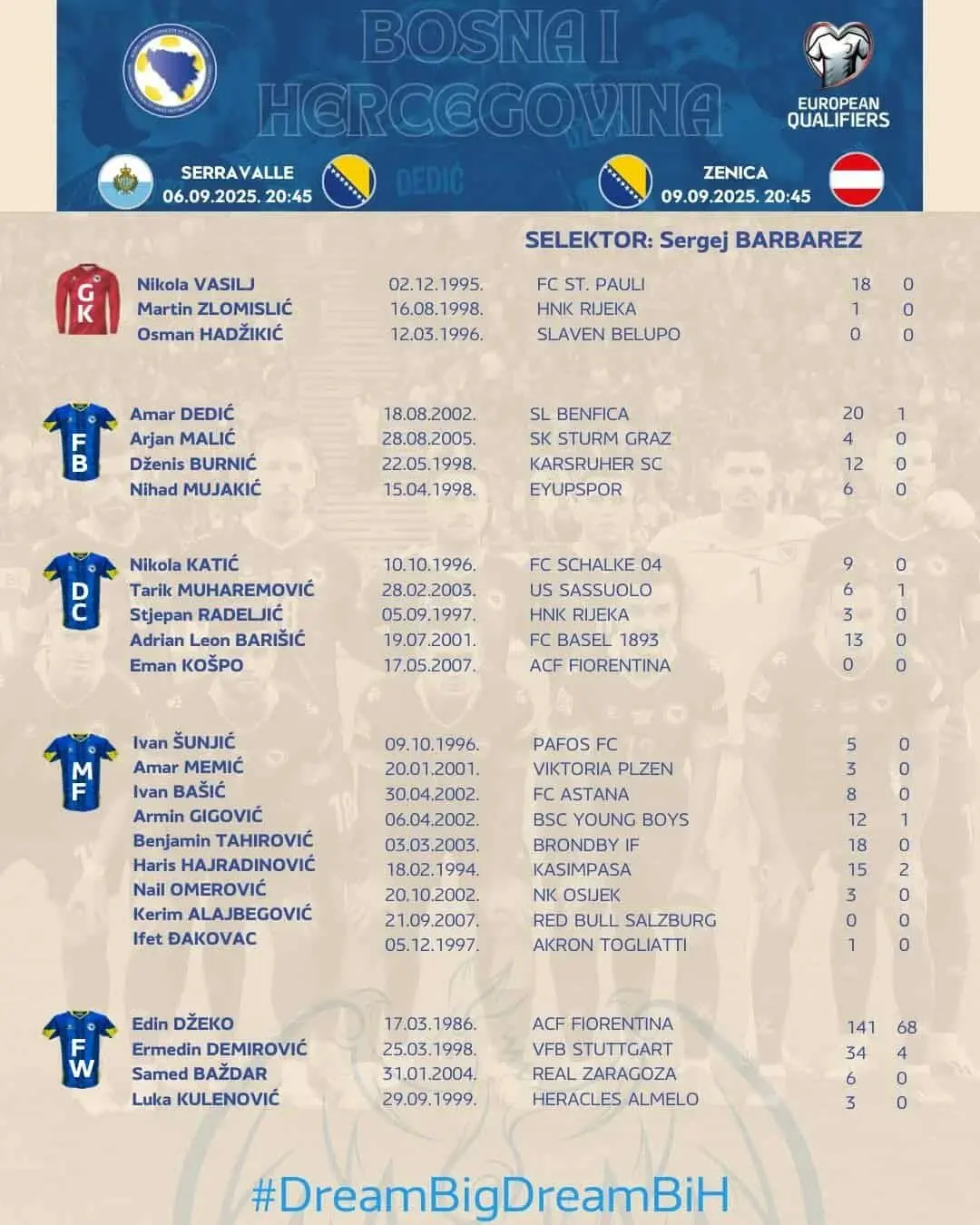 Selektor nogometne reprezentacije Bosne i Hercegovine Sergej Barbarez je objavio spisak Zmajeva za utakmice protiv San Marina i Austrije.