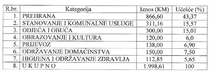 U kategoriji prehrana korištene su cijene iz 3 trgovačka centra za 82 artikla. Kada je riječ o higijeni i održavanju zdravlja ubrojani su troškovi za osam (8) stavki, a za stanovanje i komunalne usluge troškovi za šest (6) stavki. Bitno je naglasiti da za mjesec juli u troškove obrazovanja i kulture nisu uračunati troškovi kupovine knjiga, pribora i materijala za školu.