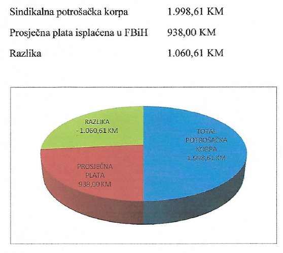 Sindikalna potrošačka korpa koju je Savez samostalnih sindikata Bosne i Hercegovine izračunao za mjesec juli 2019. godine iznosi 1.998,61 KM i za 95,55 KM je jeftinija od potrošačke korpe za prethodni mjesec. (dijagrami se nalaze na www.sssbih.com). Prosječna plata isplaćena u Federaciji BiH za mjesec maj 2019. iznosila je 938,00 KM (posljednji podatak objavljen od strane Federalnog zavoda za statistiku) i za 12 KM je viša od prosječne plate isplaćene u aprilu 2019. godine. Pokrivenost Sindikalne potrošačke korpe prosječnom platom je 46,93%.