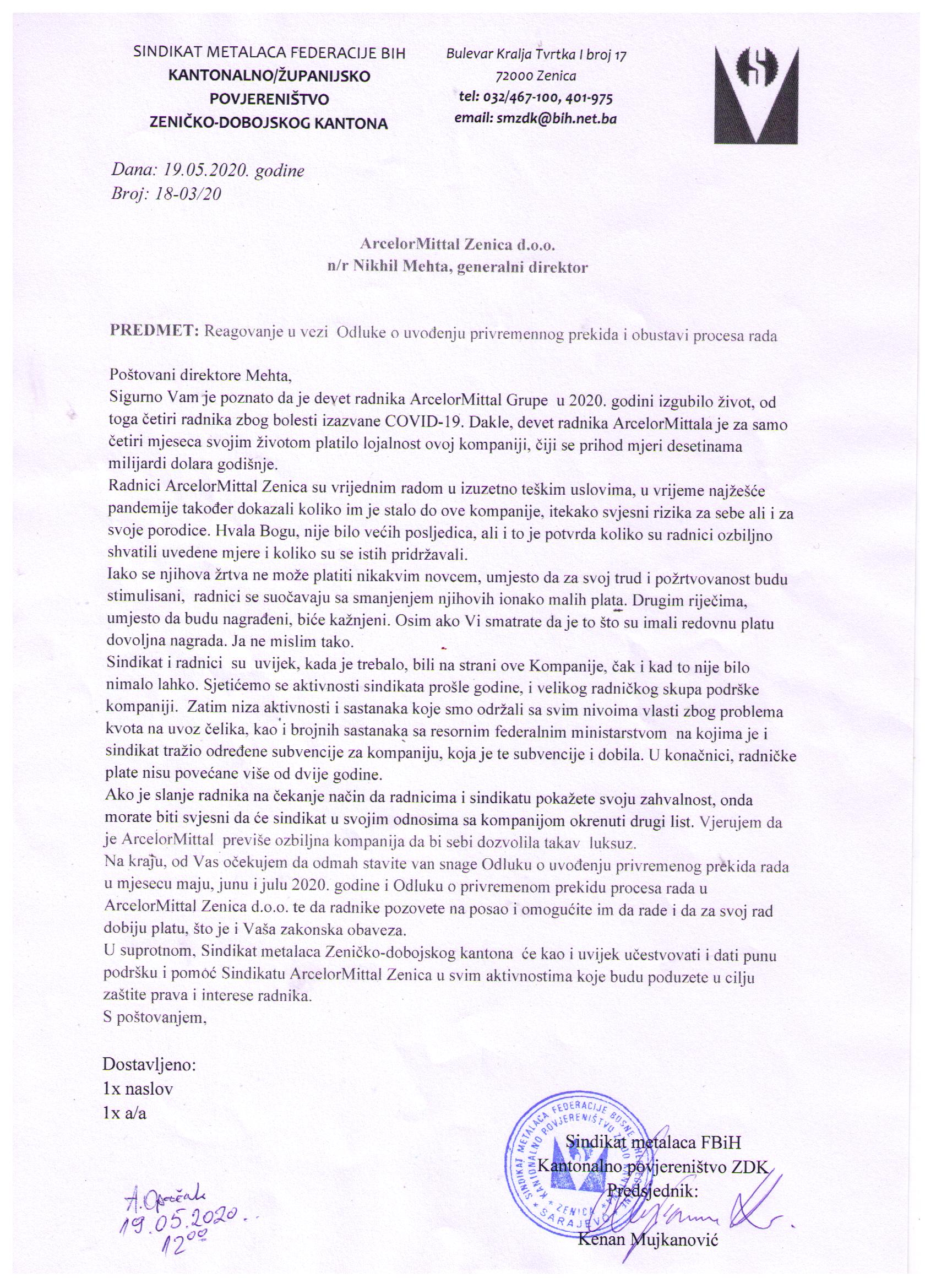 Na kraju, od Vas očekujem da odmah stavite van snage Odluku o uvođenju privremenog prekida rada u mjesecu maju, junu i julu 2020. godine i Odluku o privremenom prekidu procesa rada u ArcelorMittal Zenica d.o.o. te da radnike pozovete na posao i omogućite im da rade i da za svoj rad dobiju platu, što je i Vaša zakonska obaveza.