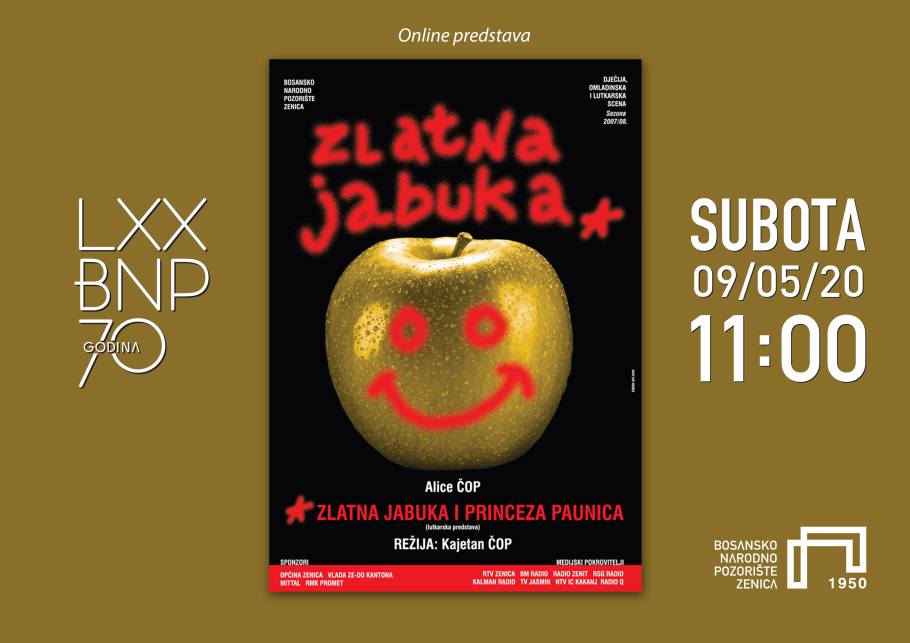 U subotu, 9. maja Bosansko narodno pozorište Zenica putem svog Youtube kanala emituje dvije predstave. Od 11 sati će biti dostupna za gledanje predstava „Zlatna jabuka i princeza Paunica“ nastala prema tekstu Alice Čop, u režiji Kajetana Čopa i u produkciji Dječije, omladinske i lutkarske scene Bosanskog narodnog pozorišta Zenica. U predstavi igraju: Nusmir Muharemović, Snežana Vidović, Tarik Marković, Siniša Vidović, Sabina Kulenović, Lana Delić, Haris Heco, Tanja Muratović i Dino Brljevac. Premijerna izvedba predstave je odigrana 7. oktobra 2007. godine.