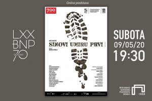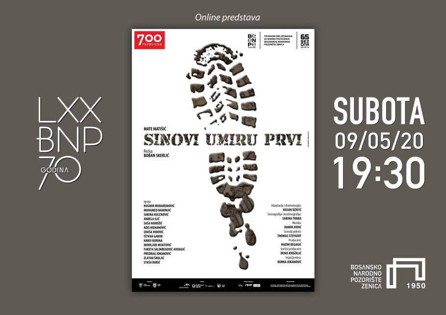 U subotu, od 19.30 sati putem Youtube kanala BNP Zenica će biti dostupna predstava „Sinovi umiru prvi“ prema tekstu Mate Matišića, u režiji Sloboda Skerlića i u produkciji Bosanskog narodnog pozorišta Zenica. U predstavi igraju: Nusmir Muharemović, Muhamed Bahonjić, Sabina Kulenović, Anđela Ilić, Saša Handžić, Adis Mehanović, Siniša Vidović, Ištvan Gabor, Haris Burina, Miroljub Mijatović, Faketa Salihbegović-Avdagić, Predrag Jokanović, Zlatan Školjić i Staša Dukić. Premijerna izvedba predstave je odigrana 25. februara 2015. godine. Predstave će biti dostupne za gledanje tokom vikenda.