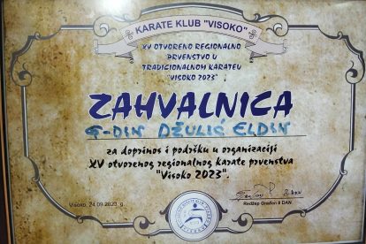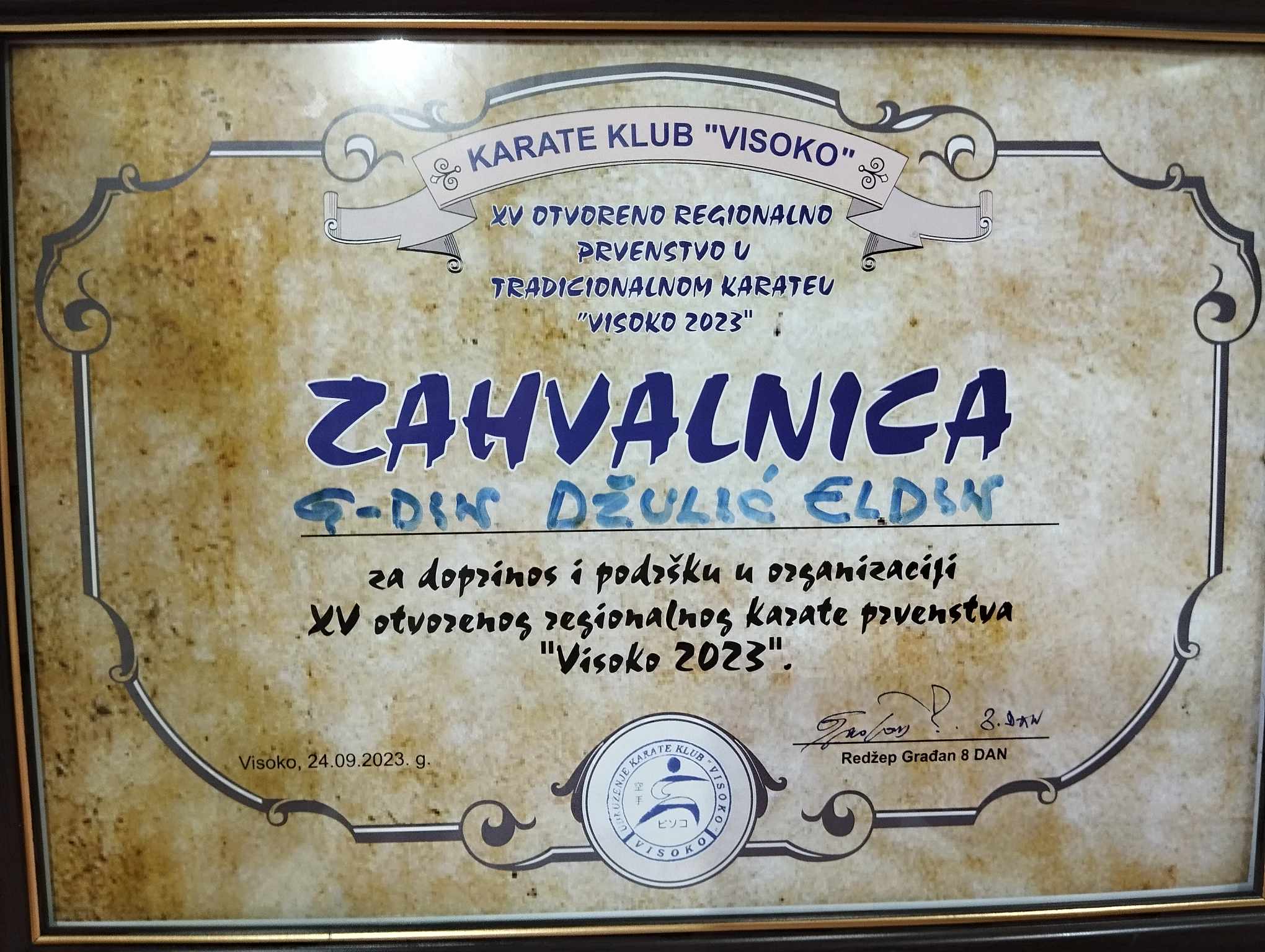 Na turniru je uručena i zahvalnica našem treneru i predsjedniku kluba Sensei Džulić Eldinu od predsjednika K.K “Visoko” Shihan Ređep Gradžan.