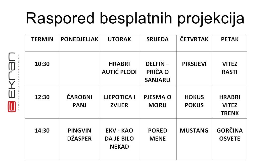Pošto naš objekat ima sopstveno grijanje, odlučili smo organizovati BESPLATNE PROJEKCIJE u Multiplexu Ekran Zenica, te ponuditi našim građanima da se ugriju u toploj kino sali 3. Od Ponedjeljka do Petka, u terminima od 10:30, 12:30 i 14:30h, imate priliku uživati u reviji fantastičnih naslova. Dobro nam došli!
