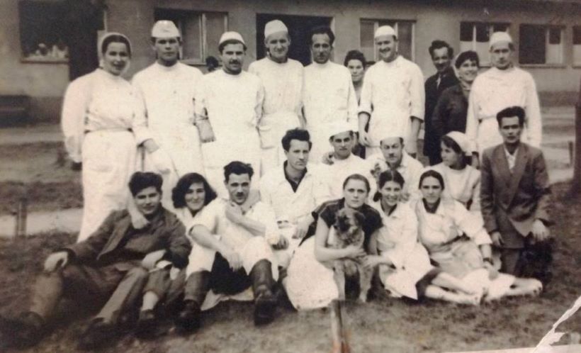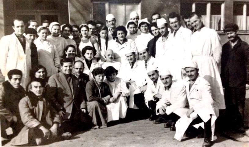 Dr Adolf Goldberger ( u sredini, s brčićima i bez kose) pred bolnicom s osobljem godine 1950.