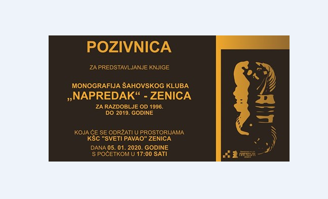ŠK Napredak Zenica: promocija Monografije šahovskog kluba “Napredak” 5. januar – Šahovski klub “Napredak” Zenica organizira predstavljanje knjige Monografija šahovskog kluba “Napredak” Zenica za razdoblje od 1996. do 2019. godine koja će se održati u prostorijama KŠC “Sveti Pavao” Zenica u nedjelju, 5. siječnja/januara 2020. godine s početkom u 17 sati.