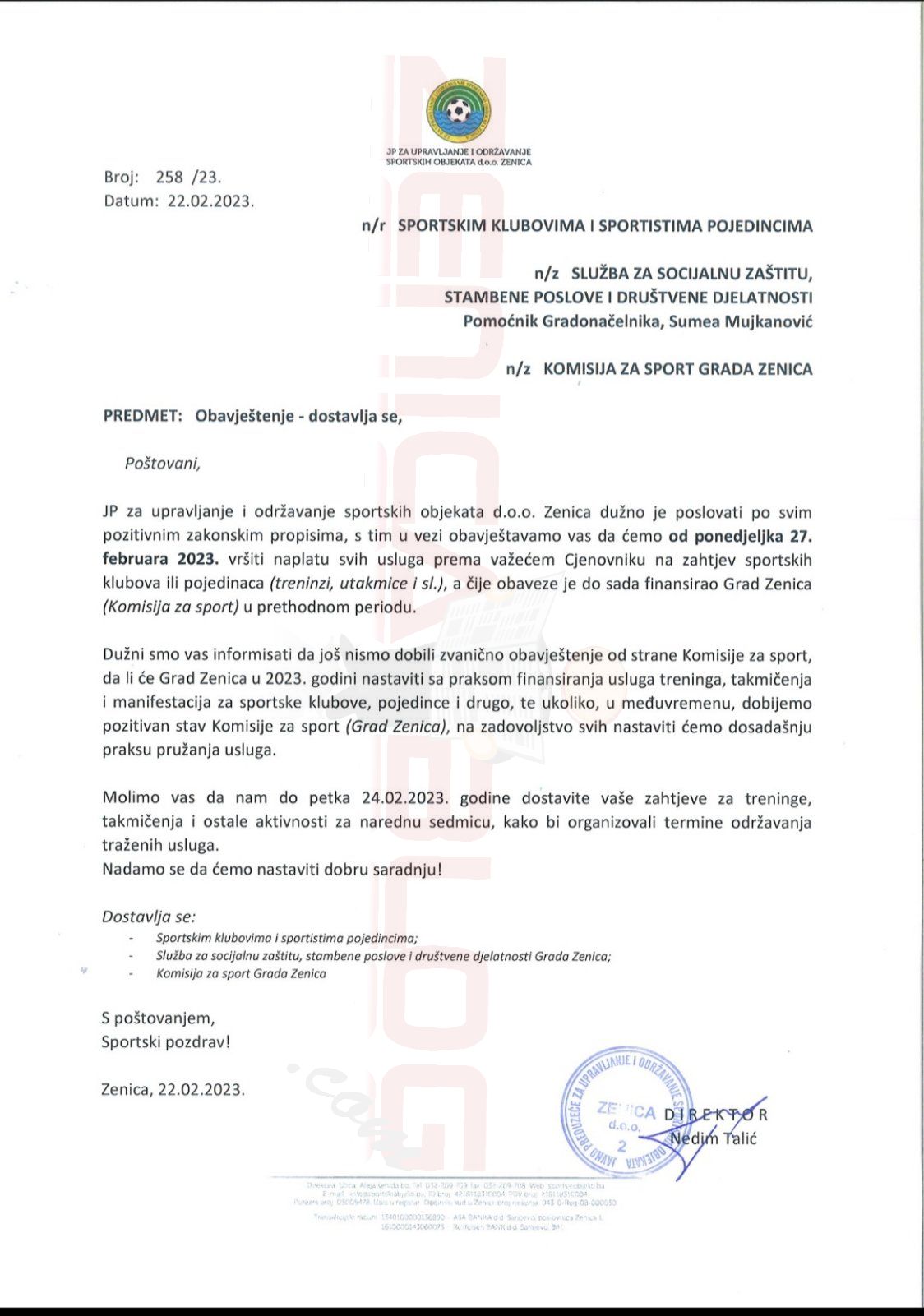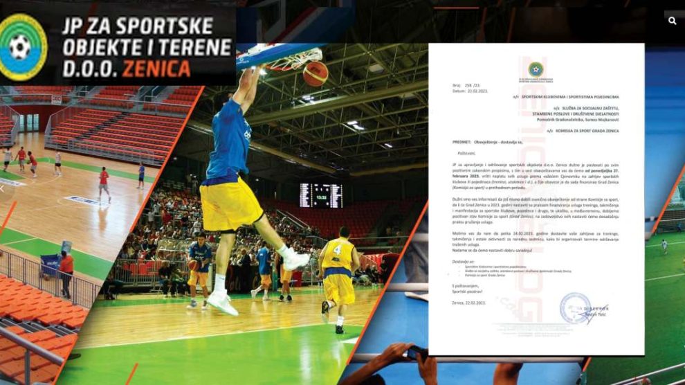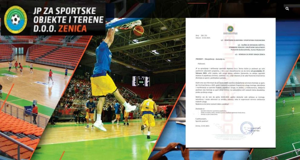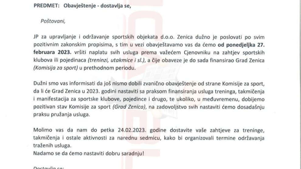 -JP za upravljanje i održavanje sportskih objekata d.o.o, Zenica dužno je poslovati po svim pozitivnim zakonskim propisima, s tlm u vezi obavještavamo vas da ćemo od ponedjeljka 27. februara 2023. vršiti naplatu svih usluga prema važećem Cjenovniku na zahtjev sportskih klubova ili pojedinaca (treninzi, utakmice I sl,), a čije obaveze je do sada financirao Grad Zenica (Komisija za sport) u prethodnom periodu, Dužni smo vas informisati da još nismo dobili zvanično obavještenje od strane Komisije za sport, da li će Grad Zenica u 2023. godini nastaviti sa praksom finansiranja usluga treninga, takmičenja i manifestacija za sportske klubove, pojedince i drugo, te ukoliko, u međuvremenu, dobijemo pozitivan stav Komisije za sport (Grad Zenica), na zadovoljstvo svih nastaviti ćemo dosadašnju praksu pružanja usluga. Molimo vas da nam do petka 24.02,2023, godine dostavite vaše zahtjeve za treninge, takmičenja i ostale aktivnosti za narednu sedmicu, kako bi organizovali termine održavanja traženih usluga. Nadamo se da ćemo nastaviti dobru saradnju! – stoji u dopisu kojeg je Talić dostavio Sportskim klubovima i sportistima pojedincima; Služba sa socijalnu zaštitu, stambene poslove i društvene djelatnosti Grada Zenica i Komisiji za sport Grada Zenica još u srijedu.
