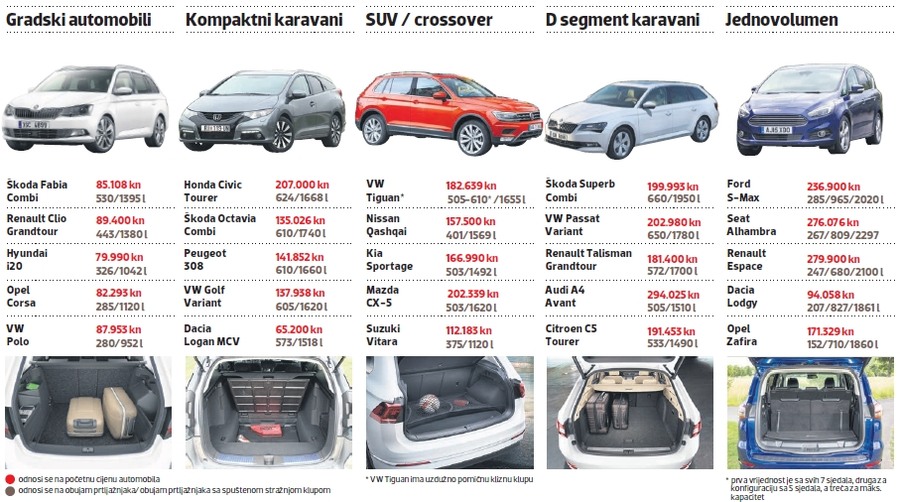 Kod popularnih kompaktnih SUV-ova naprostraniji je novi VW Tiguan, koji ima uzdužno pomičnu stražnju klupu i maksimalno može primiti čak 610 litara prtljage. U D segmentu opet je najbolja Škoda, čija karavanska izvedba Superb Combi prima čak 660 l, samo 10 litara više od bratskog karavanskog VW Passata.