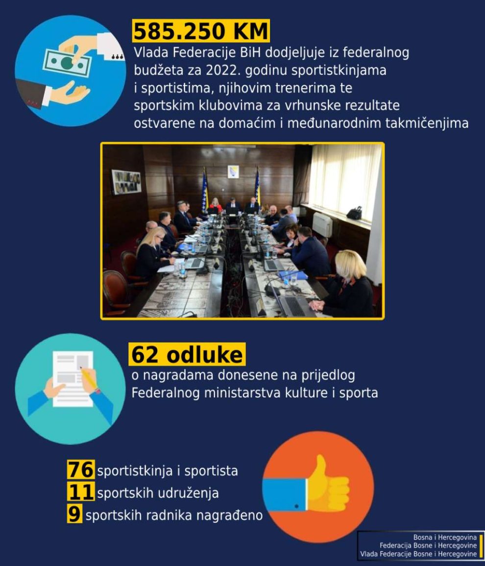 Vlada Federacije BiH je na današnjoj sjednici u Sarajevu, na prijedlog Federalnog ministarstva kulture i sporta, donijela 62 odluke o dodjeli nagrada sportistkinjama i sportistima, njihovim trenerima te sportskim klubovima za vrhunske rezultate ostvarene na domaćim i međunarodnim takmičenjima, u ukupnom iznosu od 585.250 KM.