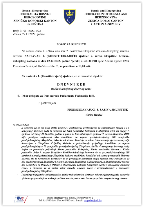 Predstavnici medija sutra i prekosutra pratit će dvije sjednice Skupštine ZDK sa istom tačkom dnevnog reda, a to je izbor delegata za Dom naroda Parlamenta FBiH.