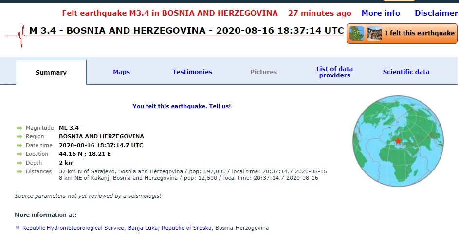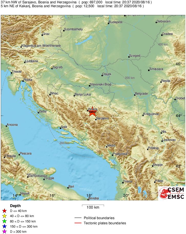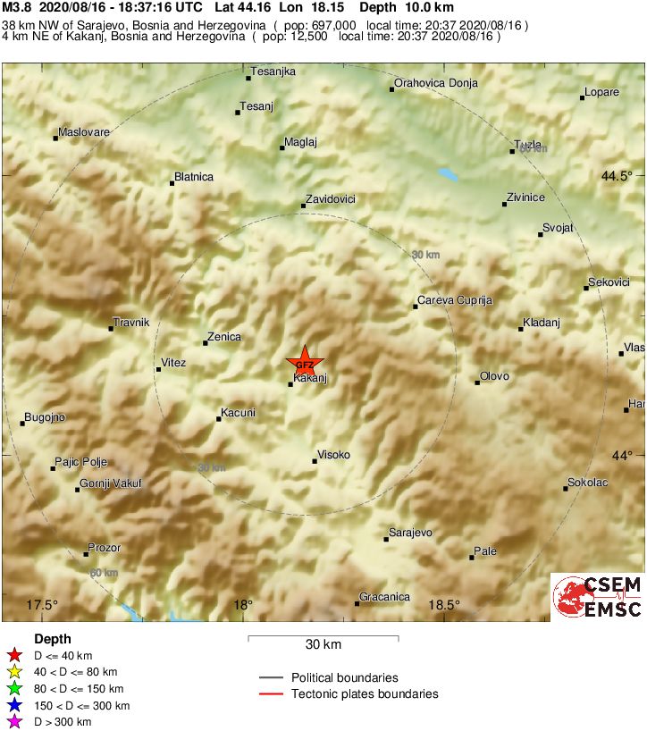 Zemljotres slabijeg intenziteta osjetili su večeras građani na području Zenice. Prema EMSC-u, epicentar zemljotresa jačine 3.4 stepena je bio osam kilometara sjeveroistočno od Kaknja, na dubini od dva kilometra.