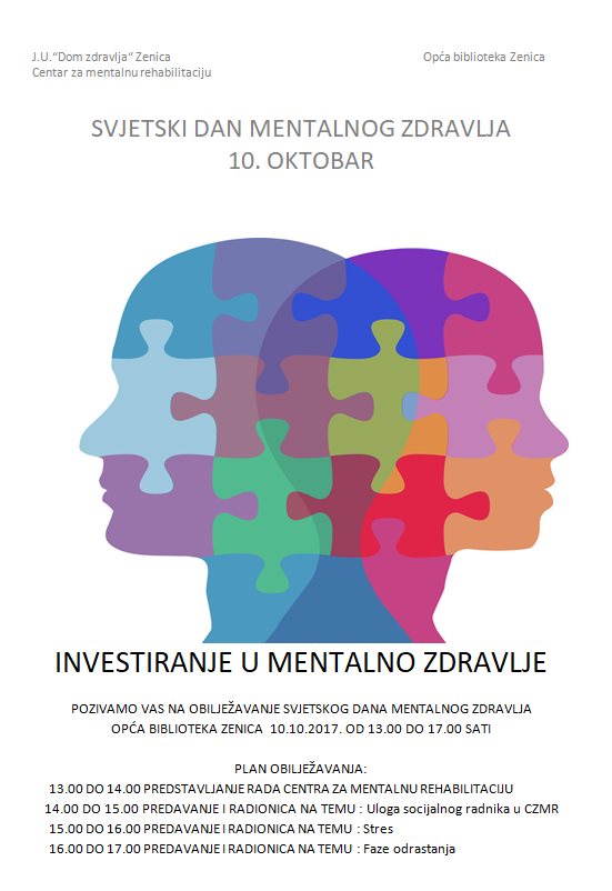 Jedan vid promocije mentalnog zdravlja danas će uposlenici CMZ-a upriličiti za građanstvo u Općoj biblioteci grada Zenice od 13,00 do 15,00 sa različitim predavanjima i radionicama.