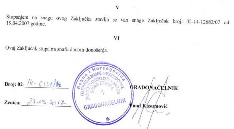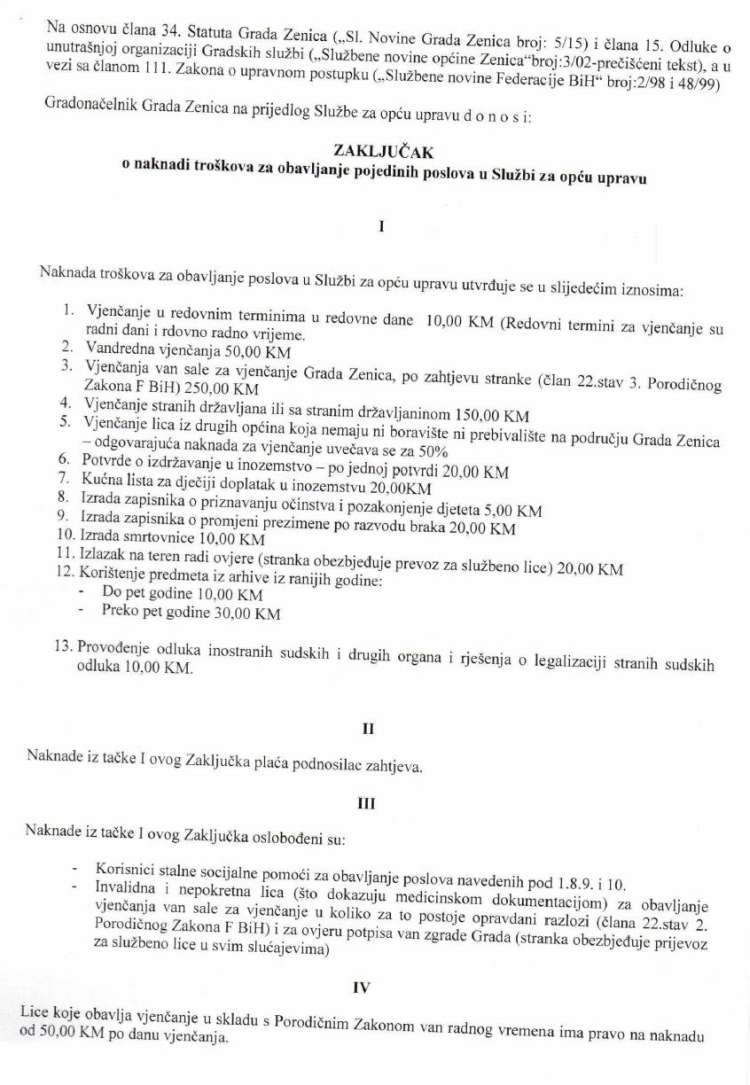 Smanjenje cijene vjenčanja van zgrade Gradske uprave – Gradonačelnik Zenice, Fuad Kasumović potpisao je zaključak o naknadi troškova za obavljanje poslova u Službi za opću upravu. Zaključkom se smanjuju cijene usluga, što je od interesa za građane Zenice. Posebno je do smanjenja cijene došlo kada su u pitanju vjenčanja i to ona koja se obavljaju van sale za vjenčanje Grada Zenice.