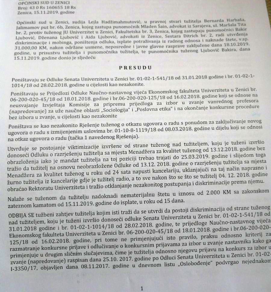 Jedan od njih, Bernard Harbaš je “dobio” na sudu UNZE, a presudom je definirano da se van snage stavljaju dvije odluke Senata, Odluka Naučno-nastavnog vijeća Ekonomskog fakulteta UNZE, te Rješenje o otkazu ugovora o radu sa ponudom zaključenja novog Ugovora pod izmijenjenim uslovima.