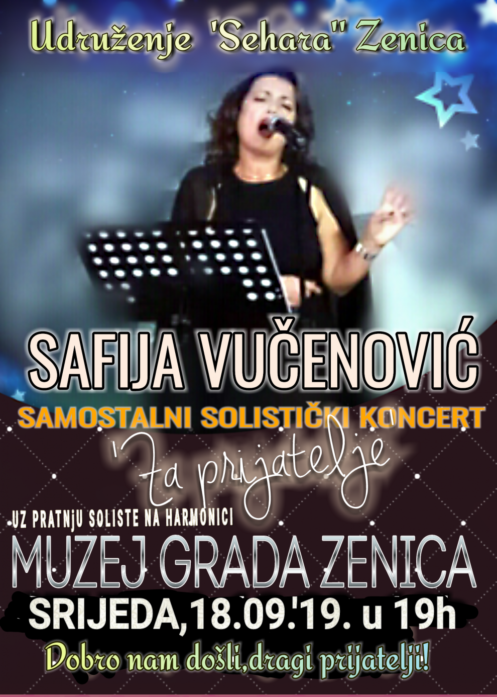 Solistički koncert Safije Vučenović u Muzeju Grada Zenice – Za srijedu, 18.09.2019. najavljujemo vam treći, solistički koncert Zeničanke, Safije Vučenović, koja je svoja prva dva koncerta imala u okviru zeničkog zimskog festivala Cabaret Winter Fest, predstaviljajući se sa najljepšim starogradskim i narodnim pjesmama, kao i sevdalinkama. Od tada pa do danas je muzički aktivna i nastupa sa svojim bendom.
