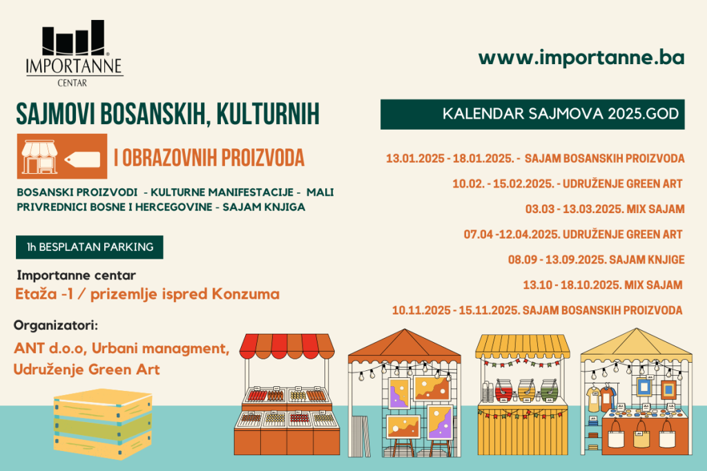U 2025. godini Importanne centar donosi i priprema mnoštvo aktivnosti ali ono što prvo izdvaja za svakog posjetitelja jeste da su u suradnji sa udruženjima ANT d.o.o, Green Art i Urbani management tokom cijele godine za sve posjetitelje pripremili veoma bogat kalendar sajmova koji vam donosi mnoštvo razloga za posjetiti ovaj šoping centar.