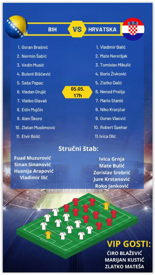 “Za BiH će nastupiti i Dževad Poturak, bosanska ‘mašina’ najbolji bokser s ovih prostora, iza kojeg su čuvene borbe i pobjede u kavezima širom svijeta. Zanimljivo da će za BiH igrati Miro Blažević, Ćirin sin, dok će u sastavu Vatrenih biti poznati glumac Slaven Knezović Grof i popularni pjevač Leo Kazić”, navode organizatori.