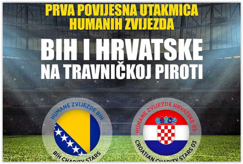 Na travničkoj Piroti 5. maja bit će odigrana humanitarna utakmica u kojoj će snage odmjeriti zvijezde Bosne i Hercegovine i Hrvatske. U bh. timu nastupat će brojni sportisti, političari i poznate ličnosti, dok će boje Vatrenih braniti uglavnom generacija iz 1998. godine. Događaju će prema najavama prisustvovati i legendarni Miroslav Ćiro Blažević