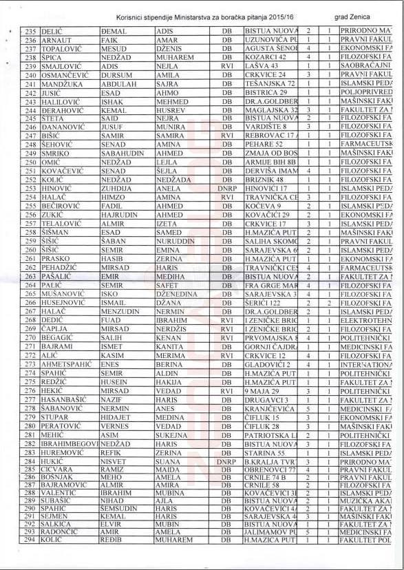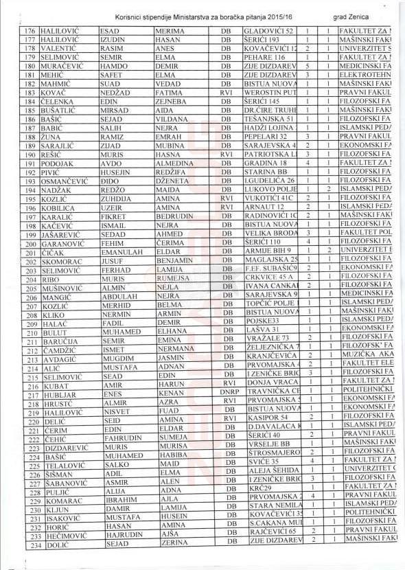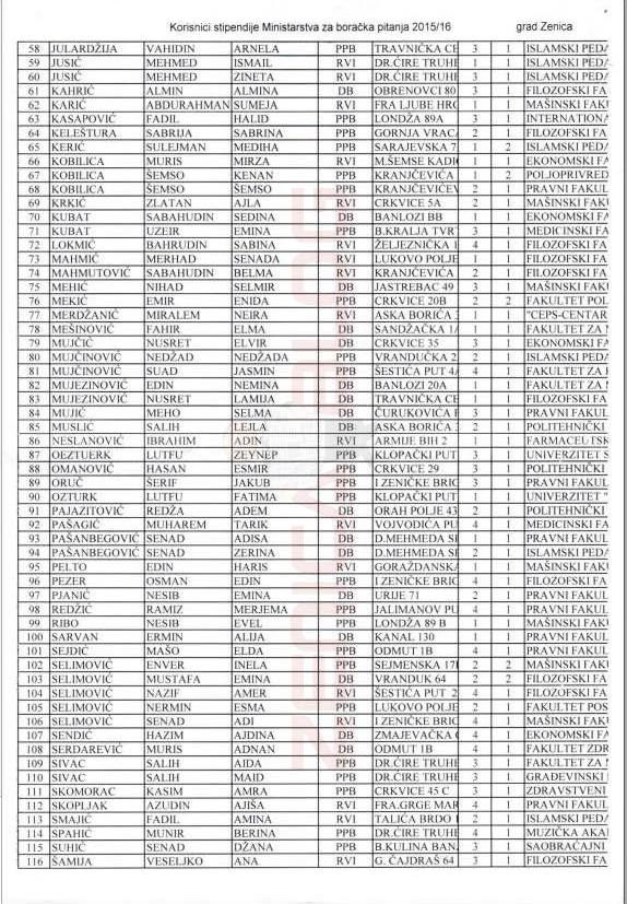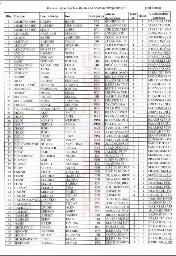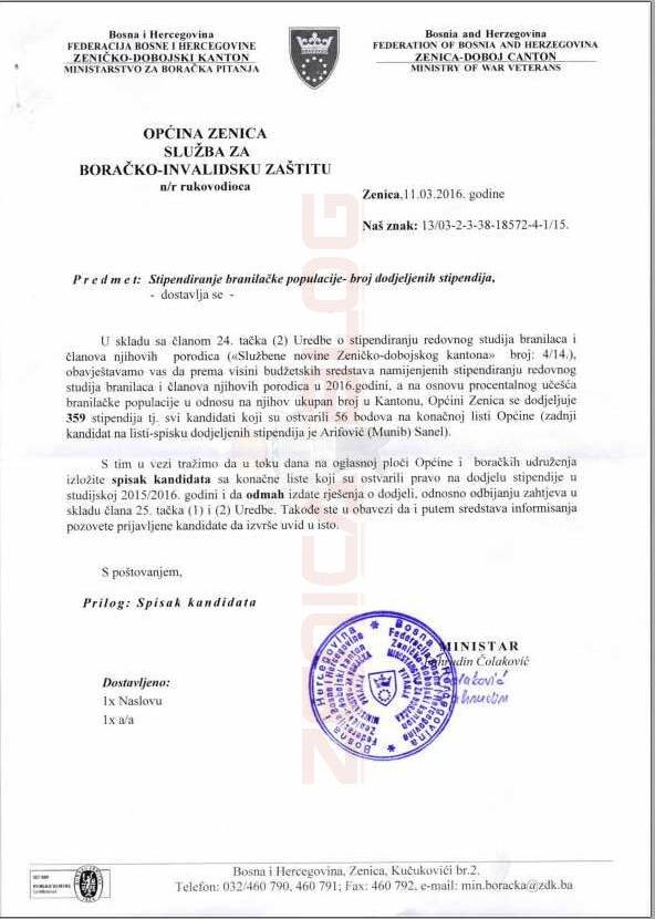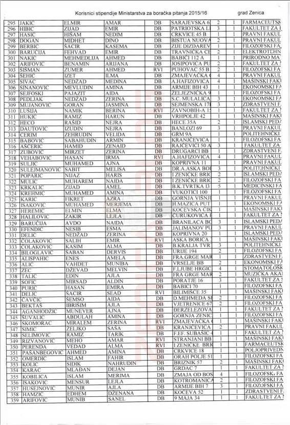 Spisak 359 boračkih stipendija Grada Zenice – Služba za boračko-invalidsku zaštitu Grada Zenica obavještava studente boračke populacije koji su aplicirali za dodjelu stipendija za akademsku 2015./2016. godinu da je Ministarstvo za boračka pitanja Zeničko-dobojskog kantona usvojilo konačnu listu stipendista.