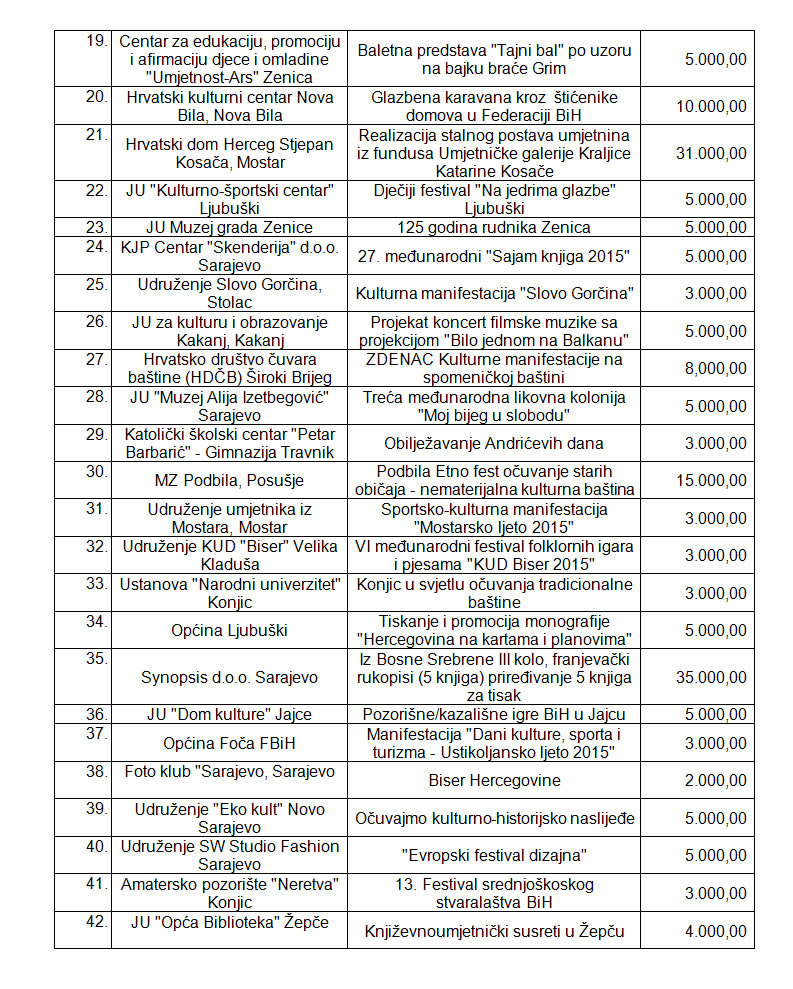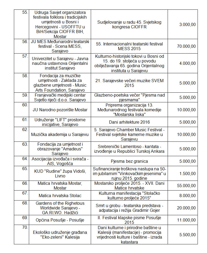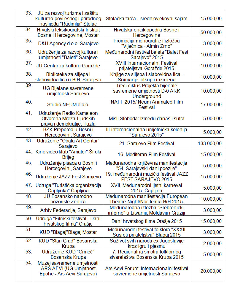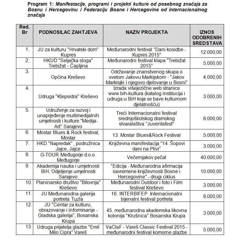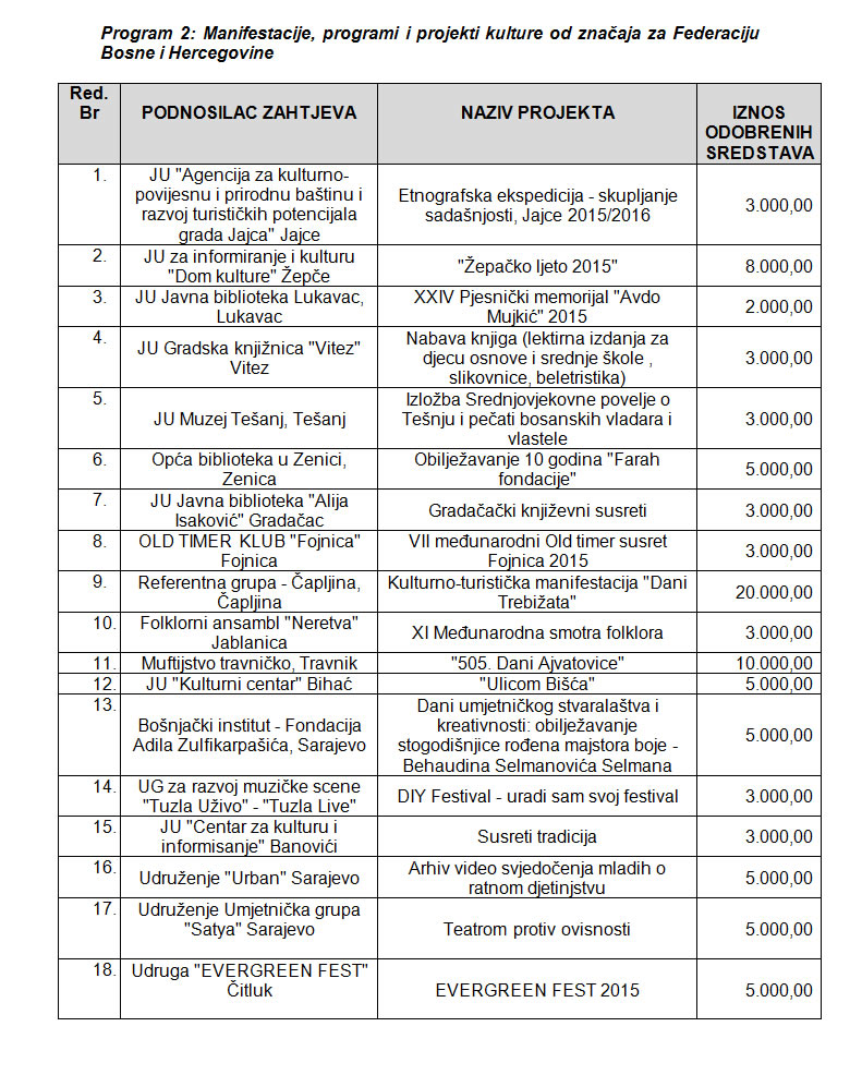 Rezultati Javnog poziva za odabir programa i projekata koji će se sufinansirati iz Budžeta Federacije Bosne i Hercegovine u 2015. godini putem Transfera za kulturu od značaja za Federaciju BiH (objavljenog 28.8.2015. godine)