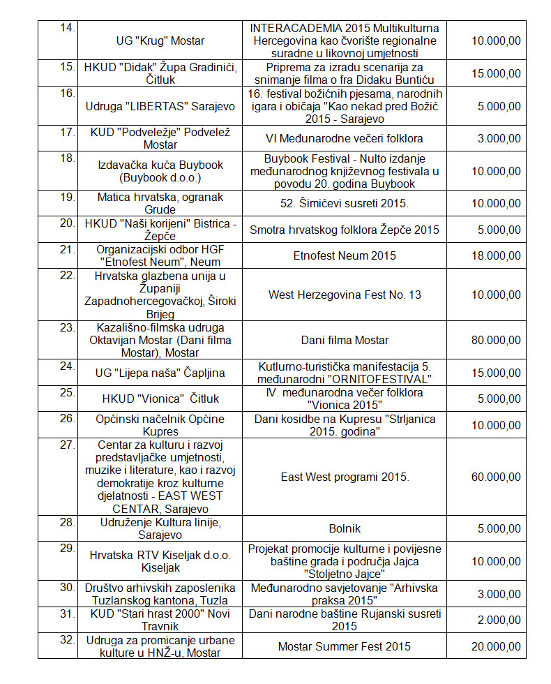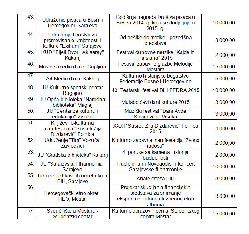 Spisak: Gdje idu milioni za kulturu u FBIH- Bez bilo kakvih komentara ili kritika u cjelosti objavljujemo rezultate Javnog poziva za odabir programa i projekata koji će se sufinansirati iz Budžeta Federacije Bosne i Hercegovine u 2015. godini putem Transfera za kulturu od značaja za Federaciju BiH.