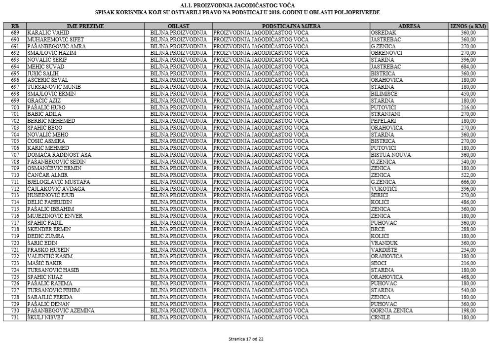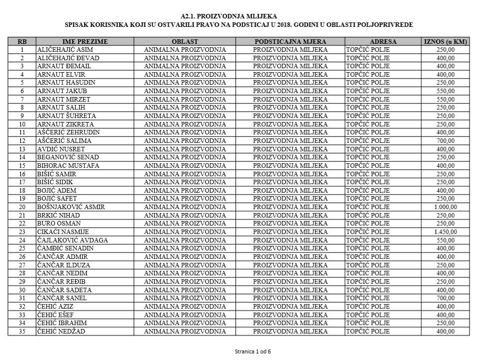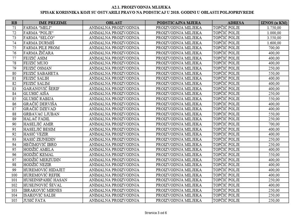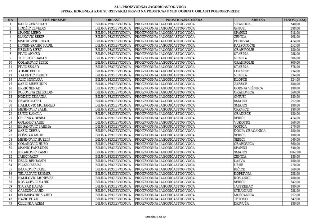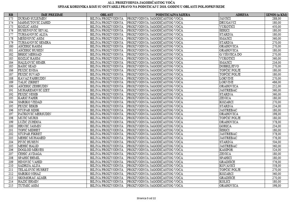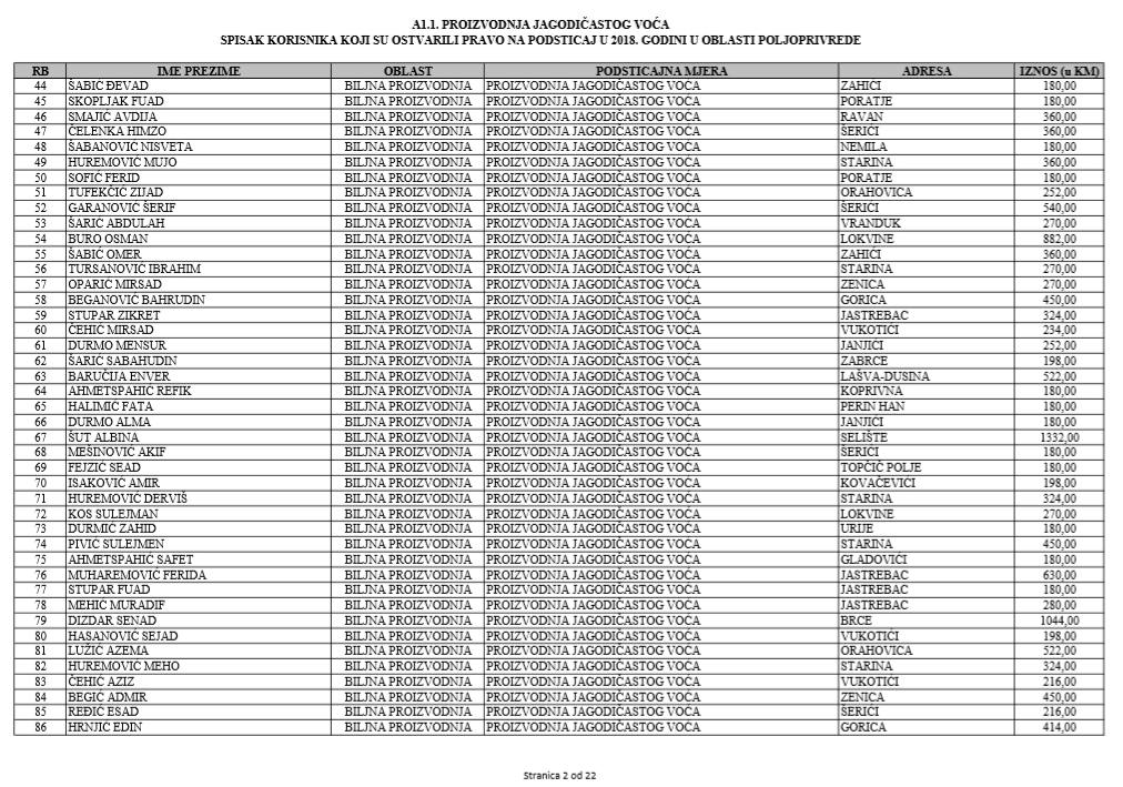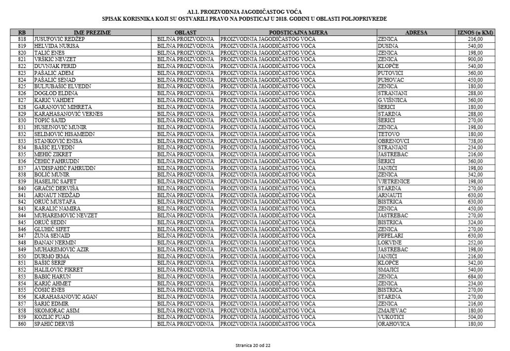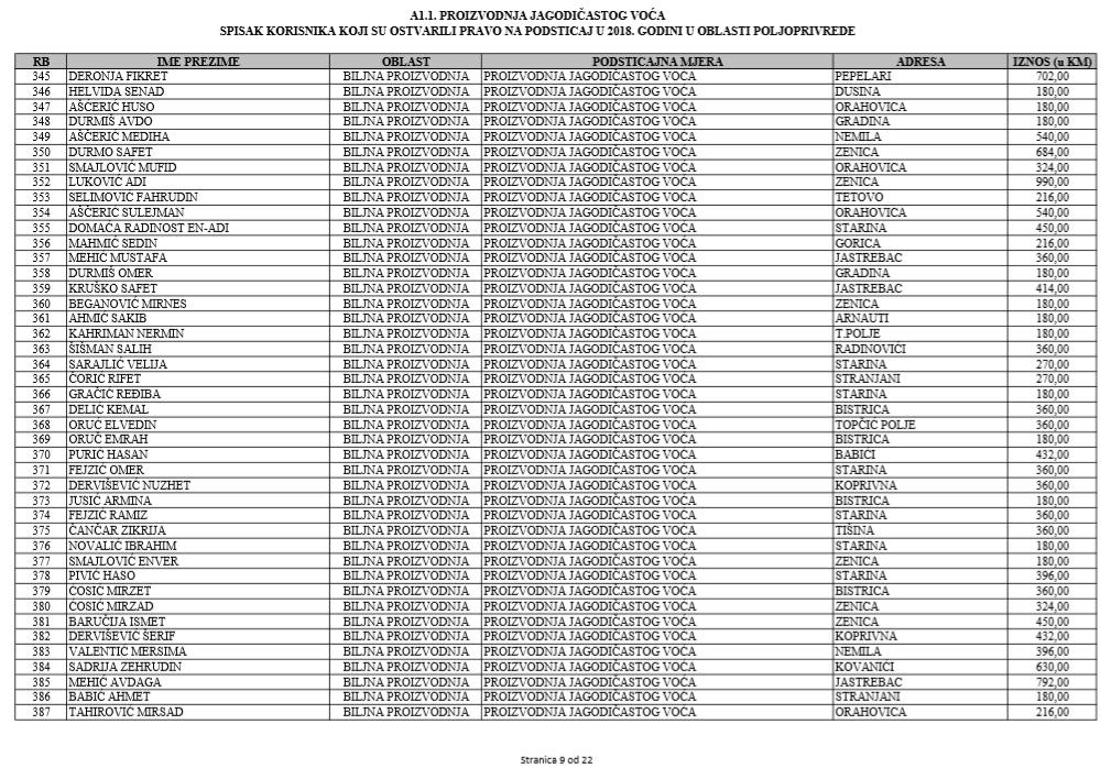 U oblasti poljoprivrede na tridesetak stranica nalaze se spiskovi onih koji su dobili novčana sredstva za pčelarstvo, mljekarstvo, ovčarstvo i kozarstvo, proizvodnju koštićavog ili jezgrastvog voća, proizvodnju u zaštićenim prostorima, uzgoj jagodičastog voća, povrće na otvorenom…