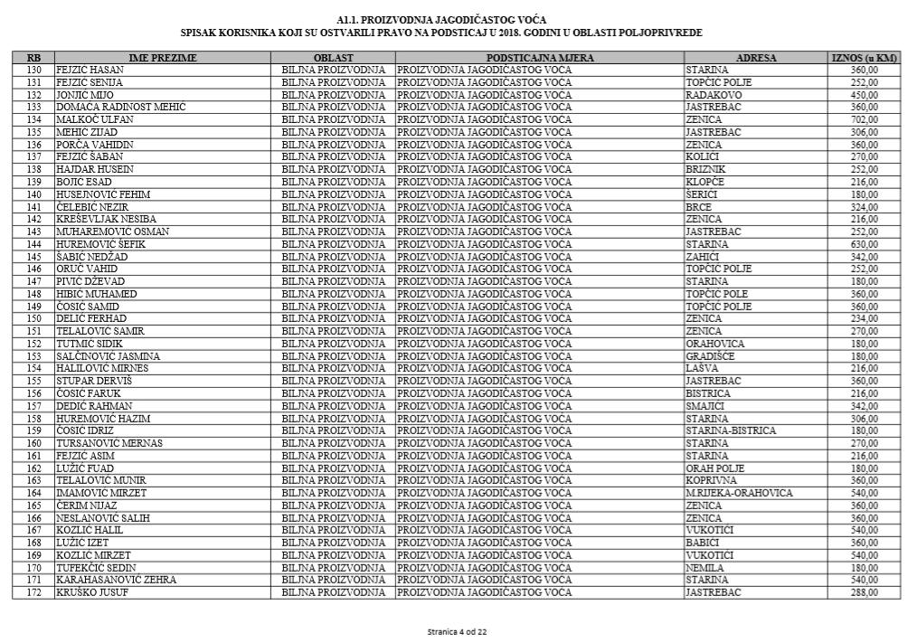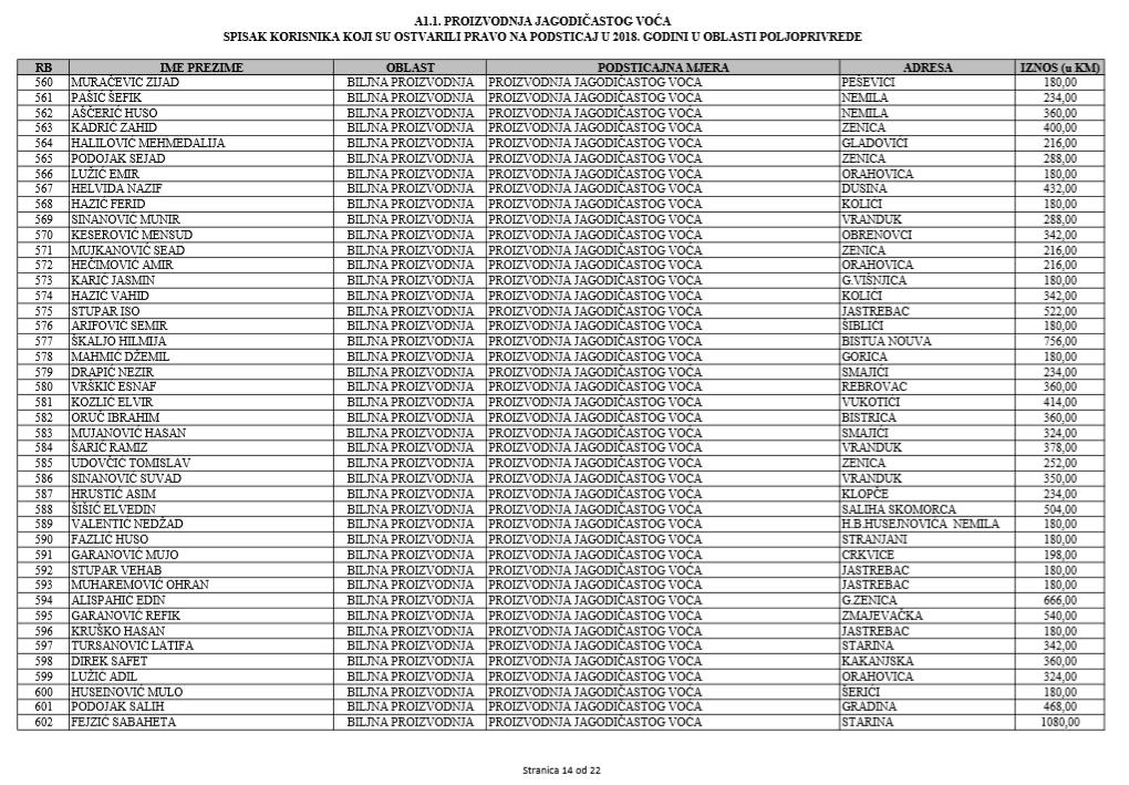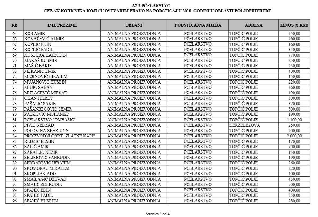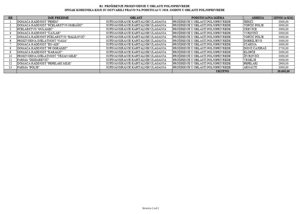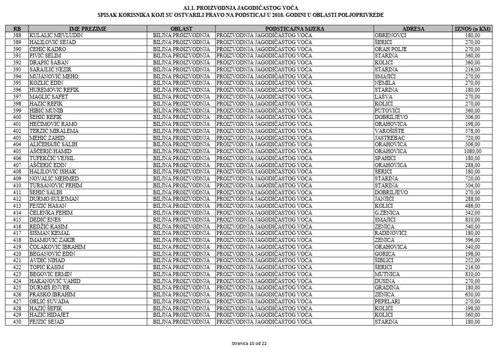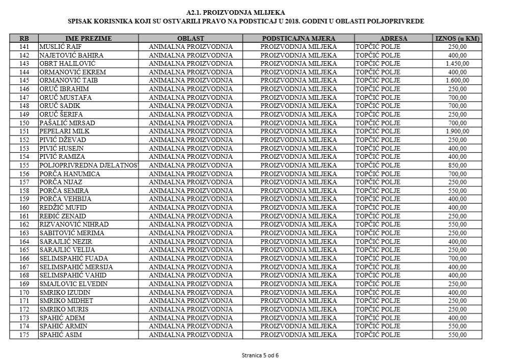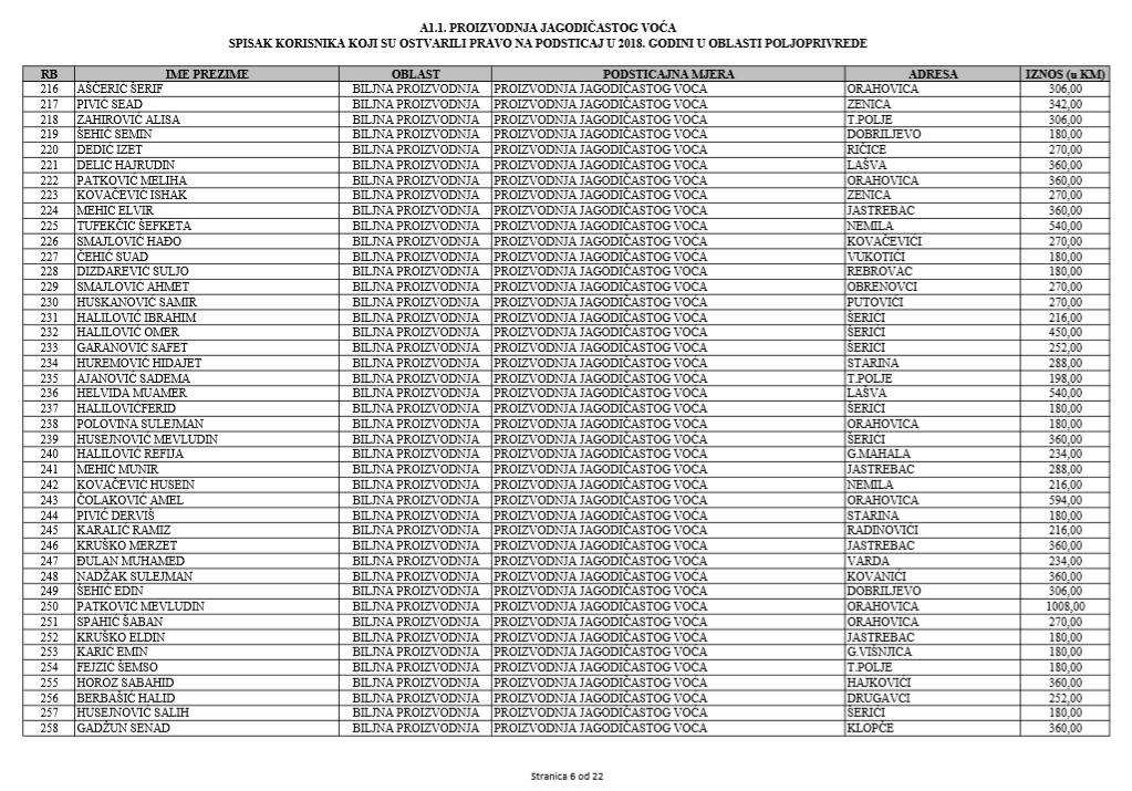 U oblasti poljoprivrede na tridesetak stranica nalaze se spiskovi onih koji su dobili novčana sredstva za pčelarstvo, mljekarstvo, ovčarstvo i kozarstvo, proizvodnju koštićavog ili jezgrastvog voća, proizvodnju u zaštićenim prostorima, uzgoj jagodičastog voća, povrće na otvorenom…