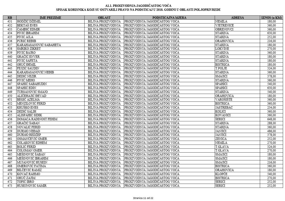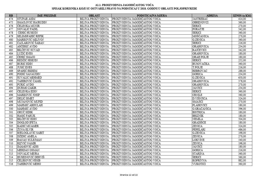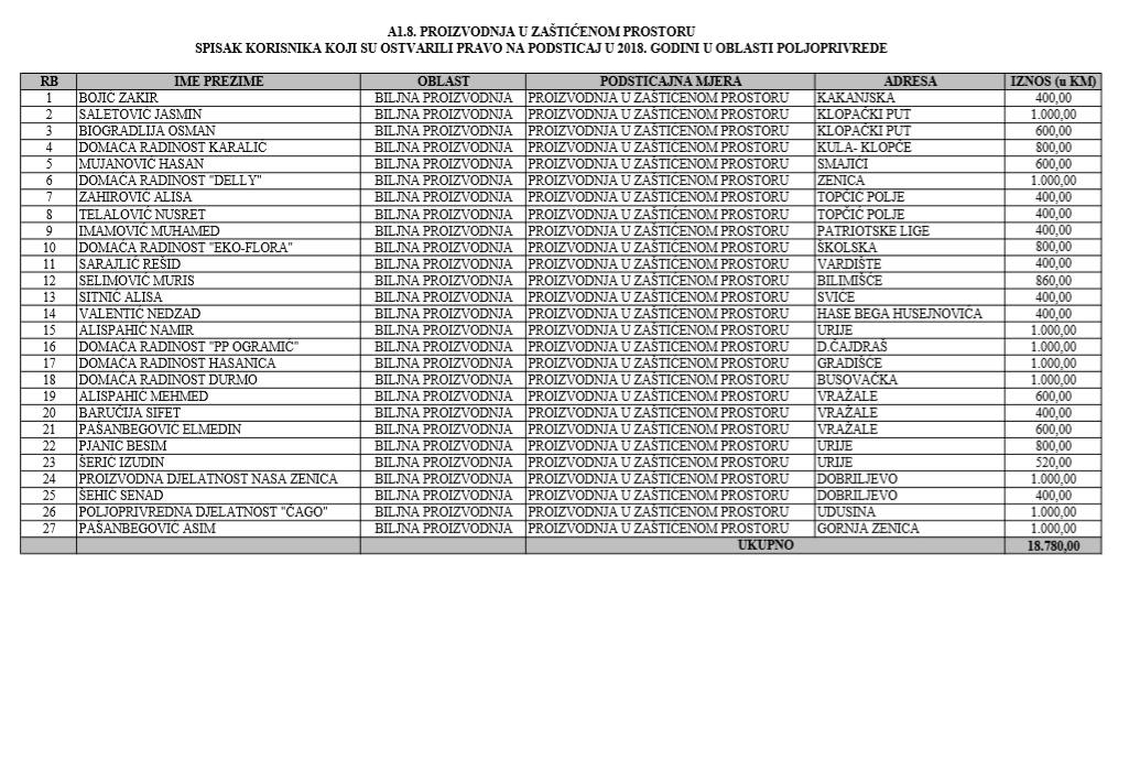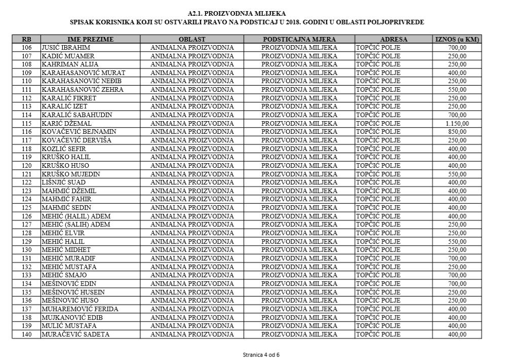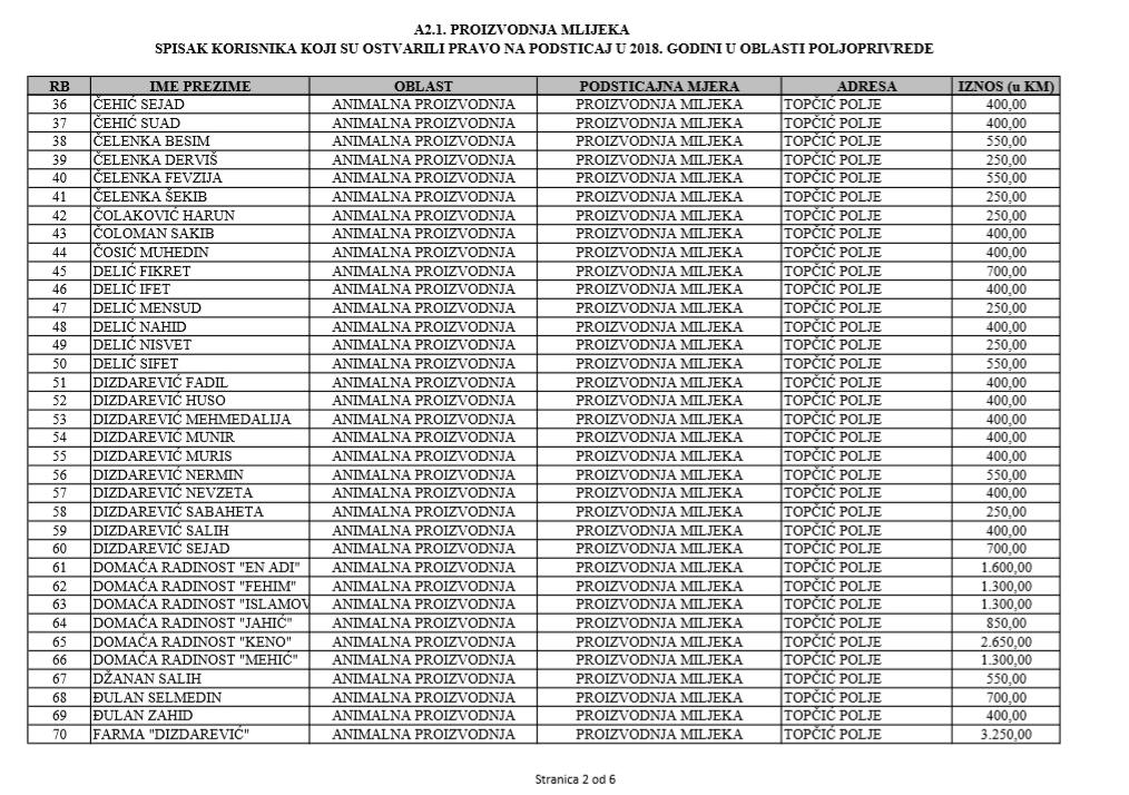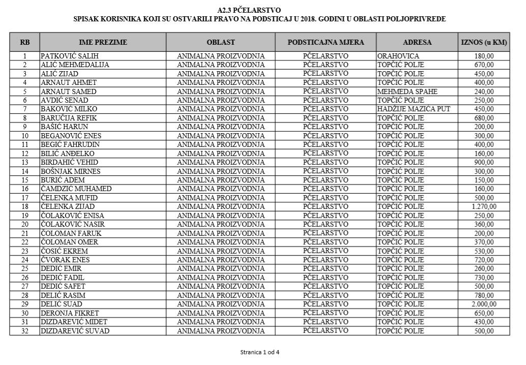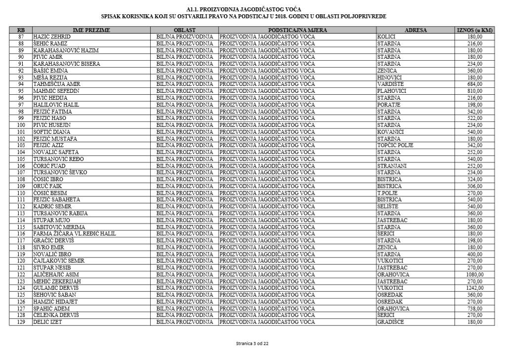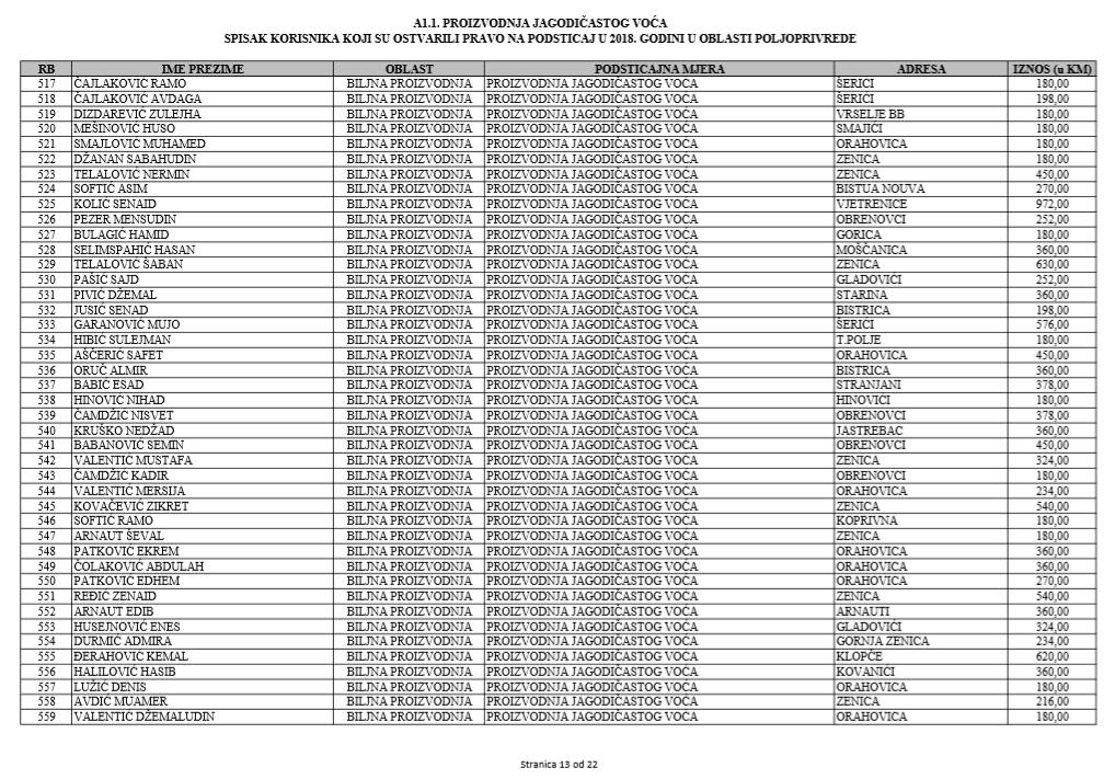 U oblasti poljoprivrede na tridesetak stranica nalaze se spiskovi onih koji su dobili novčana sredstva za pčelarstvo, mljekarstvo, ovčarstvo i kozarstvo, proizvodnju koštićavog ili jezgrastvog voća, proizvodnju u zaštićenim prostorima, uzgoj jagodičastog voća, povrće na otvorenom…