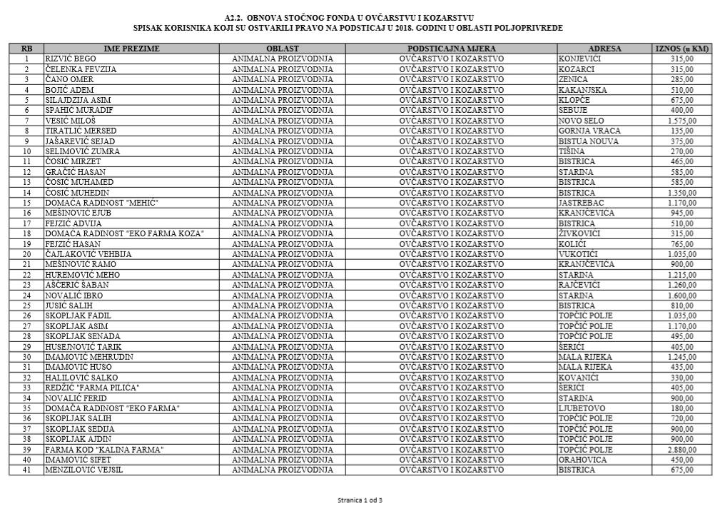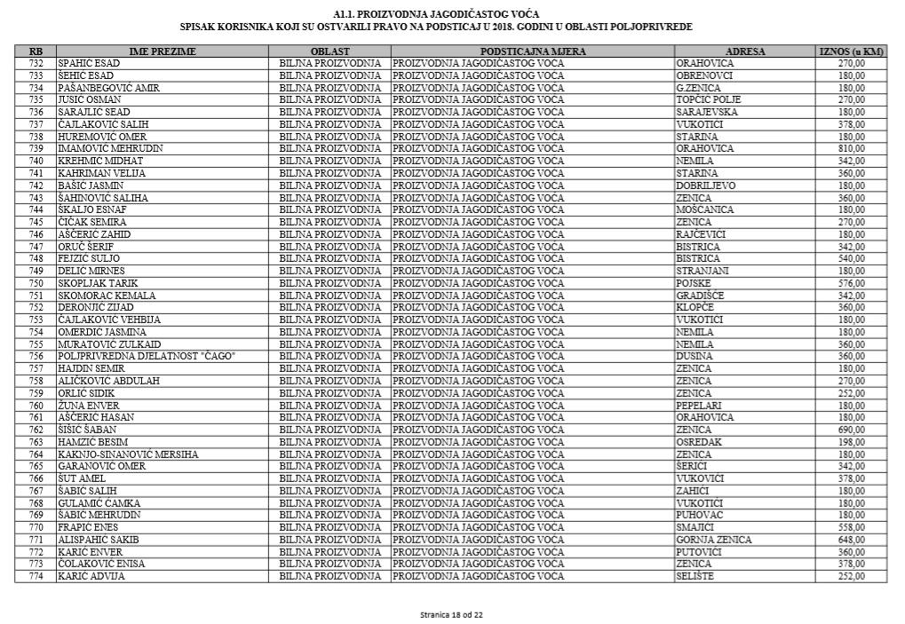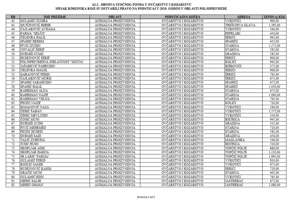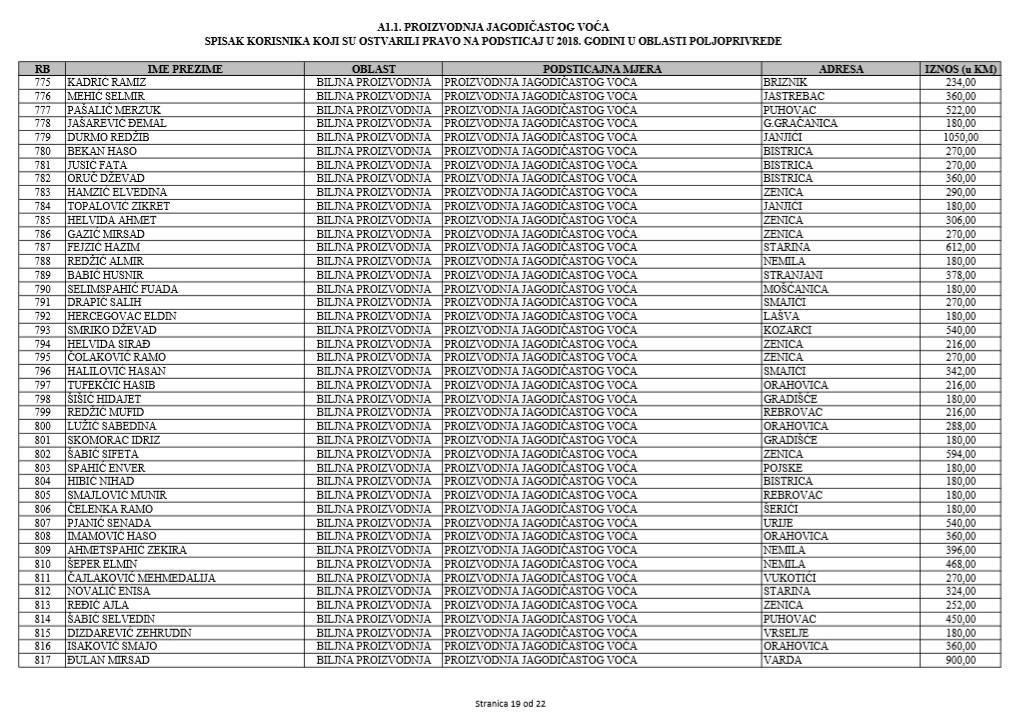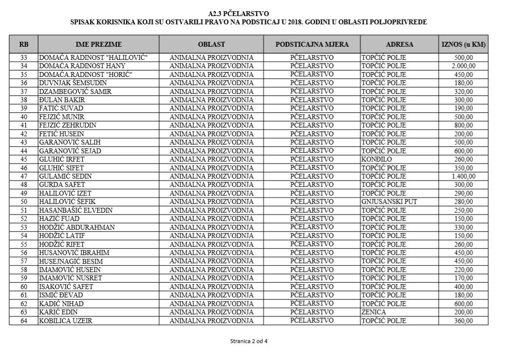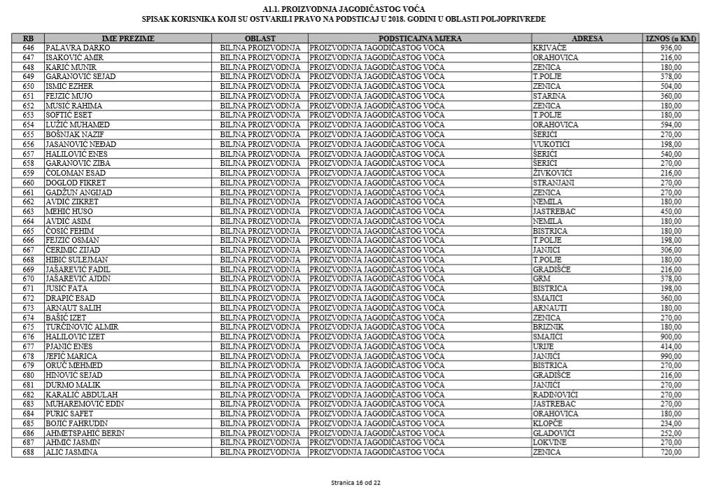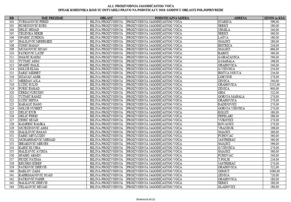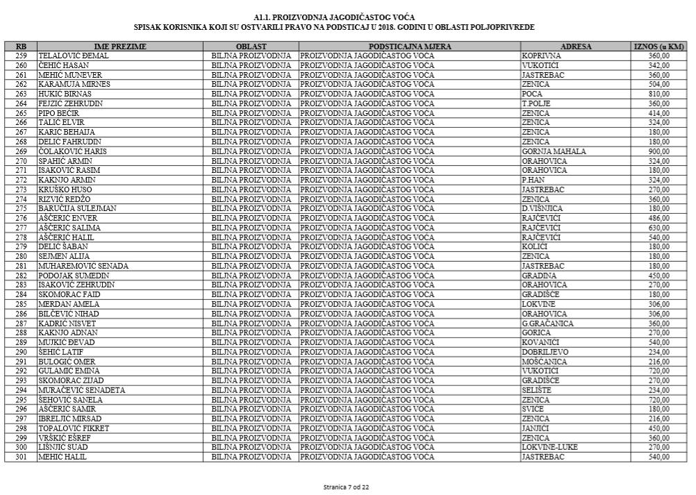 U oblasti poljoprivrede na tridesetak stranica nalaze se spiskovi onih koji su dobili novčana sredstva za pčelarstvo, mljekarstvo, ovčarstvo i kozarstvo, proizvodnju koštićavog ili jezgrastvog voća, proizvodnju u zaštićenim prostorima, uzgoj jagodičastog voća, povrće na otvorenom…