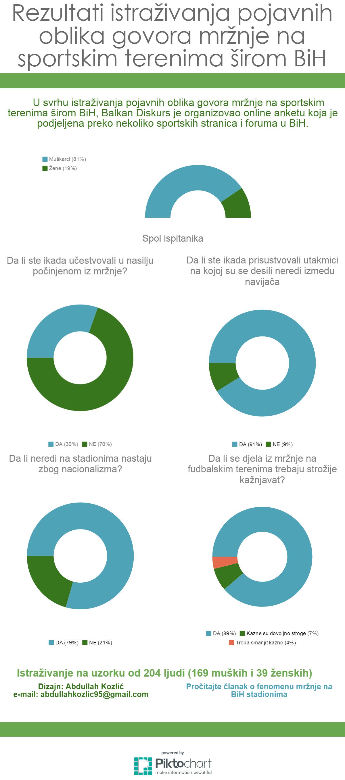 U svrhu istraživanja pojavnih oblika govora mržnje na sportskim terenima širom BiH, Balkan Diskurs je organizovao online anketu koja je podjeljena preko nekoliko sportskih stranica i foruma u BiH. U anketi su ukupno učestvovale 204 osobe, od kojih 165 muškaraca i 39 žena.