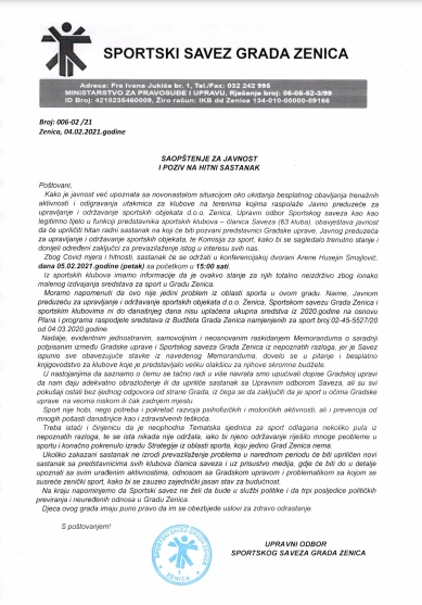 Kako je javnost već upoznata sa novonastalom situacijom oko ukidanja besplatnog obavljanja trenažnih aktivnosti i odigravanja utakmica za klubove na terenima kojima raspolaže Javno preduzeće za upravljanje i održavanje sportskih objekata d.o.o. Zenica, Upravni odbor Sportskog saveza kao kao legitimno tijelo u funkciji predstavnika sportskih klubova – članica Saveza (63 kluba), obavještava javnost da će upriličiti hitan radni sastanak na koji će biti pozvani predstavnici Gradske uprave, Javnog preduzeća za upravljanje i održavanje sportskih objekata, te Komisija za sport, kako bi se sagledalo trenutno stanje i donijeli određeni zaključci za prevazilaženje istog u interesu svih nas.