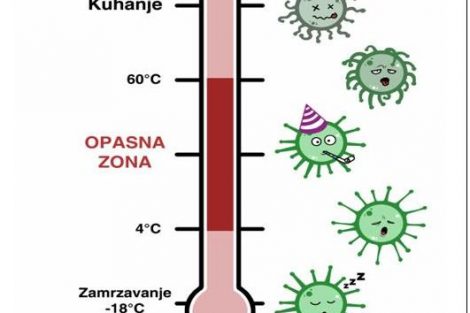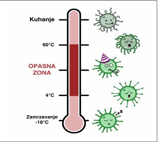 Bakterije i pored toga rastu pri svim temperaturama. Ipak, značajna većina mikroorganizama u hrani se brzo razmnožava na temperaturama između 5 i 60 stepeni Celziusa, pa je zato važno hranu što prije zagrijati na temperaturu višu od 60 ili ohladiti na temperaturu nižu od 5 stepeni.
