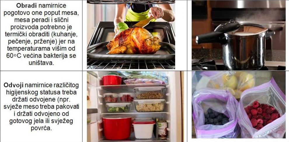 -Odvoji namirnice različitog higijenskog statusa treba držati odvojene (npr. svježe meso treba pakovati i držati odvojeno od gotovog jela ili svježeg povrća).