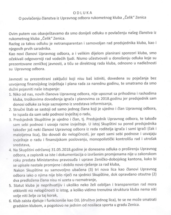 ŠR “Čelik Junior”: Povlačenje članstva iz Upravnog odbora Rukometnog kluba “Čelik” – Prije godinu dana rukovodstva dvaju rukometnih klubova iz Zenice RK “Čelik” i RK “Čelik Junior” postigli su sporazum o zajedničkom nastupu pod jednim imenom, te strategiji za budućnost.
