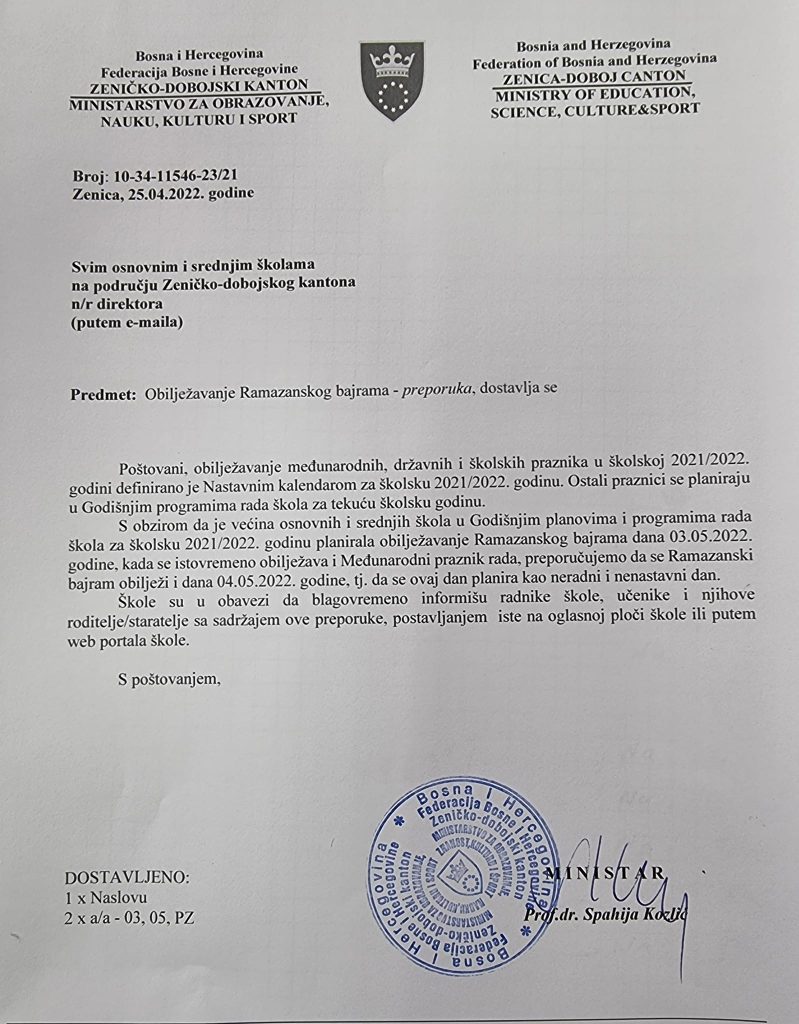 S obzirom da je većina osnovnih i srednjih škola u Godišnjim planovima i programima rada škola za školsku 2021/2022. godinu planirala obilježavanje Ramazanskog bajrama dana 03.05.2022. godine, kada se istovremeno obilježava i Međunarodni praznik rada, preporučujemo da se Ramazanski bajram obilježi dana 04.05.2022. godine tj. da se ovaj dan planira kao neradni i nenastavni dan.