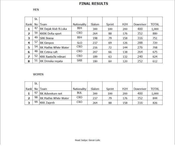 U sprintu smo osvojili treče mjesto iza domacina Dajaka kluba i Delte sport iz Splita, u H2H pobjeda protiv Rastockih Mlinara iz Slunja, u polufinalu zanimljiva borba sa Dajakom ipak su pobjedili domaci iz Banja Luke i u borbi za treče mjesto pobjedili smo Matis White Water iz Varazdina, slalom je malo bio slabiji kao sto smo i ocekivali, ali ponovo u spustu zanimljiva borba i opet treči sa zaostatkom 5 sekundi iza Delte. Tih 5 sekundi zaostatka za 2. poziciom na Euro cupu nam daje veliki motiv i saznanje da smo mi ekipa koja je sazrela i tehnički, a i fizički.