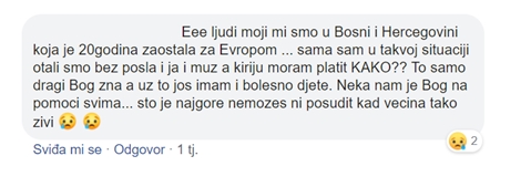 “Eee ljudi moji mi smo u Bosni i Hercegovini koja je 20 godina zaostala za Evropom … sama sam u takvoj situaciji otali smo bez posla i ja i muž a kiriju moram platit KAKO?? To samo dragi Bog zna, a uz to jos imam i bolesno dijete. Neka nam je Bog na pomoći svima… što je najgore ne mozes ni posudit kad većina tako živi :'( :'(“. Jedan od primjera u kojem je naša korisnica željela ostati anonimna.