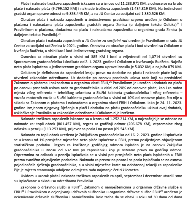 -Pravilnikom je utvrđen i dodatak na plaću po osnovu posebnih uslova rada za gradonačelnika u visini od 20 posto od osnovne plaće, kao i za radna mjesta višeg referenta – tehničkog sekretara u Službi kabineta gradonačelnika i višeg referenta – vozača motornih vozila u Službi kabineta gradonačelnika u visini od 10 posto od osnovne plaće, što nije u skladu sa Zakonom o plaćama i naknadama u organima vlasti FBiH i Odlukom – istkanuli su revizori.
