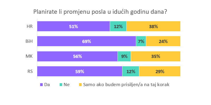Ne čudi stoga podatak da čak 69% zaposlenih u BiH planira promijeniti posao u narednih godinu dana, što je najviši udio u regiji. Istovremeno, tek 19% ispitanika strahuje da bi mogli ostati bez posla, što ukazuje na relativno visok osjećaj zapošljivosti.