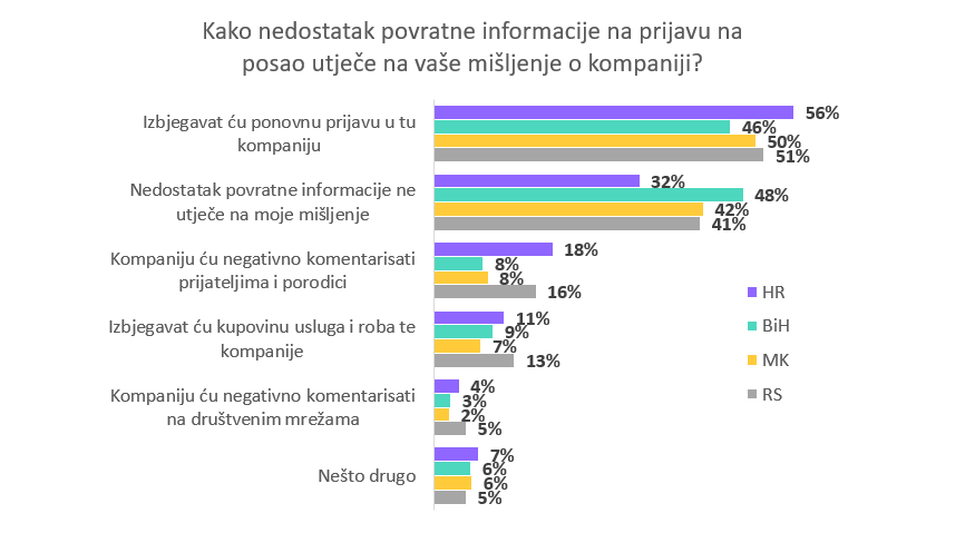 Komunikacija s kandidatima i dalje predstavlja izazov. Čak 41% ispitanika iz BiH rijetko dobije odgovor na prijavu za posao, dok 17% navodi da odgovor gotovo nikad ne dobije. Iako BiH u ovom segmentu stoji nešto bolje u odnosu na pojedine zemlje regije, podaci jasno pokazuju da prostor za unapređenje i dalje postoji.