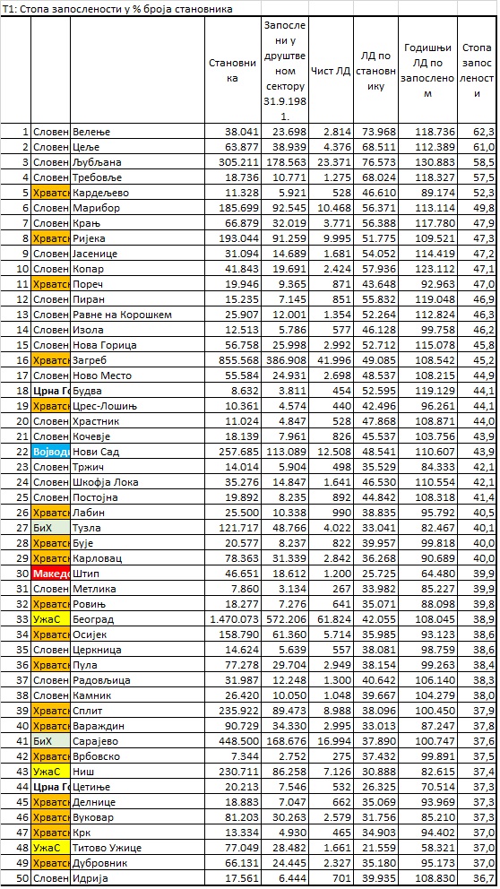 U prvih 50 općina prema stopi zaposlenosti, osim slovenačkih i hrvatskih našli su se Budva na 18. mjestu, Novi Sad na 22., Tuzla na 27., Štip na 30., Beograd na 33., Sarajevo na 41., Niš na 43., Cetinje na 44. i Titovo Užice na 48. mjestu.