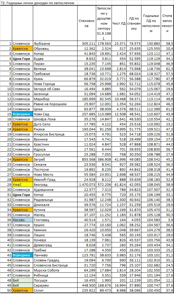 Nakon Budve, van Slovenije i Hrvatske, slijedi Novi Sad na 15. mjestu sa godišnjim ličnim dohotkom od 110.607 dinara, Beograd na 29. sa 108.047 dinara (koji je imao gotovo jednake zarade kao i Zagreb), zatim Kotor na 31. mjestu sa 106.199 dinara, Glogovac na 36. sa 104.583 dinara, Pančevo na 43. sa 103.101 dinarom, Posušje na 48. sa 101.054 i Sarajevo na 49. mjestu sa 100.747 dinara godišnjeg ličnog dohotka po stanovniku.