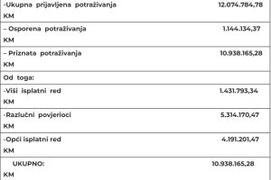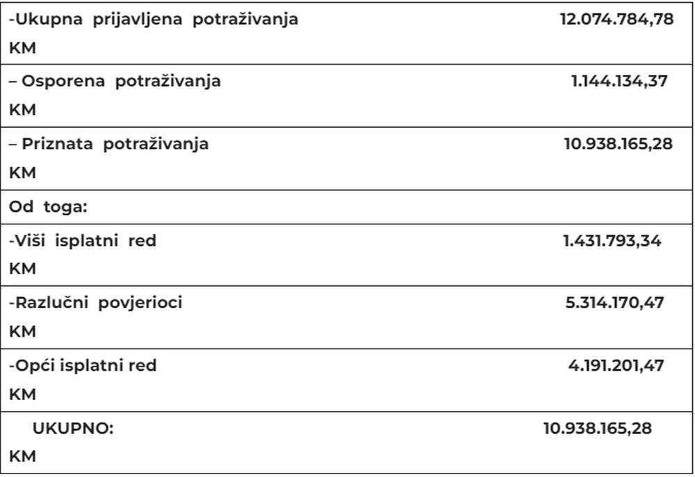 U periodu stečajnog postupka nad stečajnim dužnikom ukupno prijavljena i priznata potraživanja iznose:
