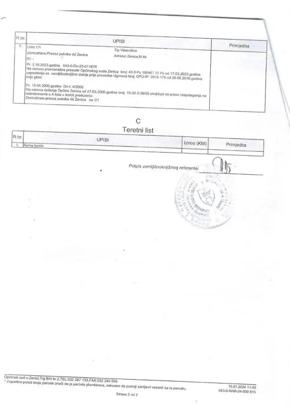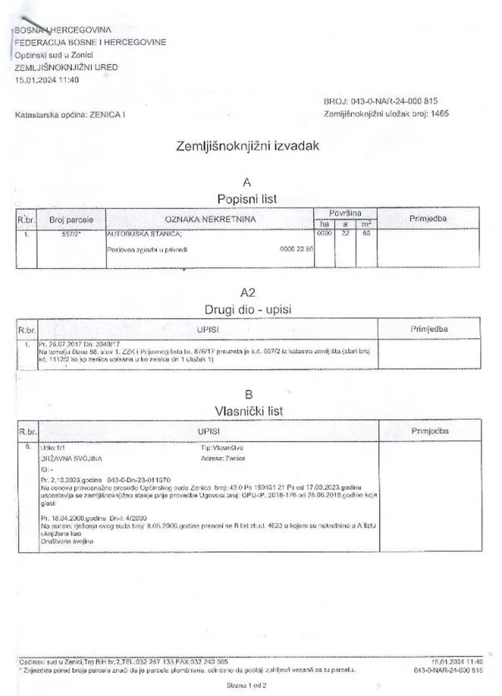 Podsjećam Vas da je nekretnina zvana Autobuska stanica“,površine 2285 m2 k.č.557/2,zk.ul.1465 vraćena u stečajnu masu stečajnog dužnika presudom Vrhovnog suda FBIH od juna 2024.godine.Posjedujem ZK uložak u kojem se vidi da smo vlasnici predmetne nekretnine i da ta nekretnina nije pod teretom.( U prilogu Vam prilažem ZK uložak od 15.01.2024.godine),radi što objektivnijeg informisanja javnosti.